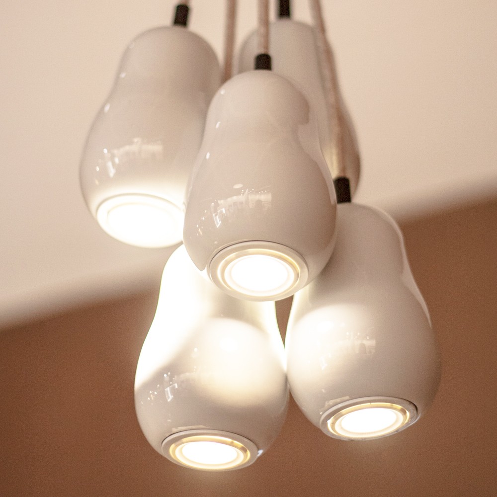 Minimaliste conception les lampes de table et les plafonniers peuvent être utilisés seuls Source de lumièree ou en foule, créant une ambiance particulière art sculptural. Leurs formes arrondies sensuelles rappellent la sensualité des courbes féminines, qui coïncident harmonieusement avec la forme de l'ampoule à l'intérieur. Le charme chaleureux de la nature est émis par le revêtement du bois de hêtre et de chêne, avec des détails en porcelaine blanche.