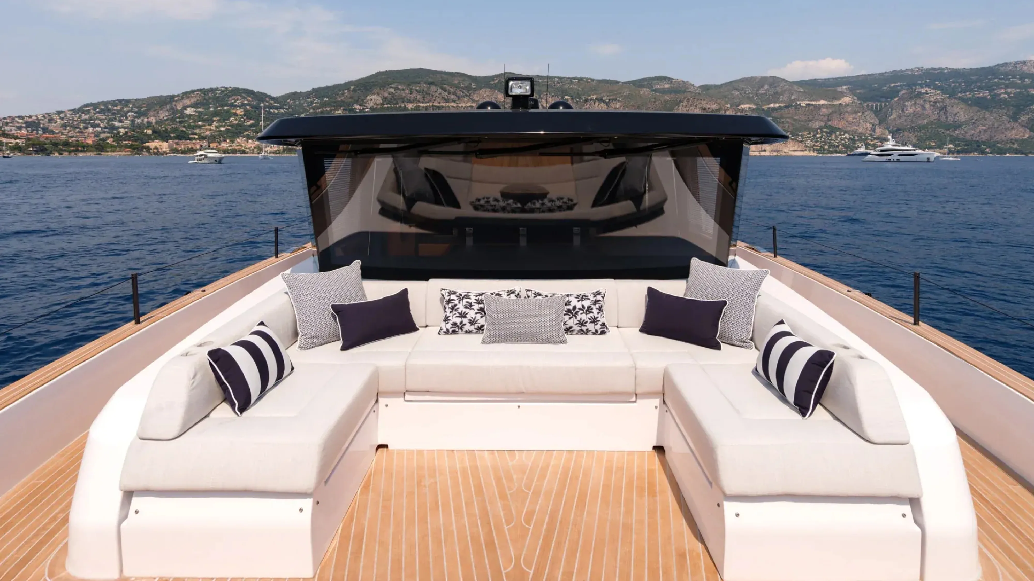 À l'avant, un autre coin salon en U est aménagé avec un bain de soleil et des dossiers lestés mobiles, permettant de moduler facilement l'espace selon vos envies. Avec des réfrigérateurs, des rangements et un système audio Fusion avec zones sonores séparées, chaque recoin du yacht est conçu pour un séjour relaxant.