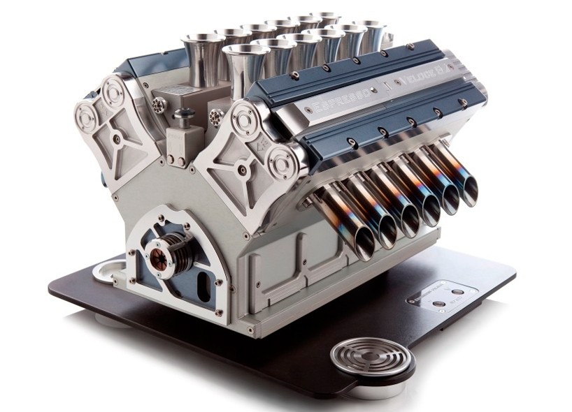 Démarrons notre moteur du matin à plein régime ! Espresso Veloce a conçu une superbe machine à café V12 en hommage au moteur de course de Grand Prix de renommée mondiale des années 90, reproduisant les parties les plus sophistiquées de la bête d'acier.