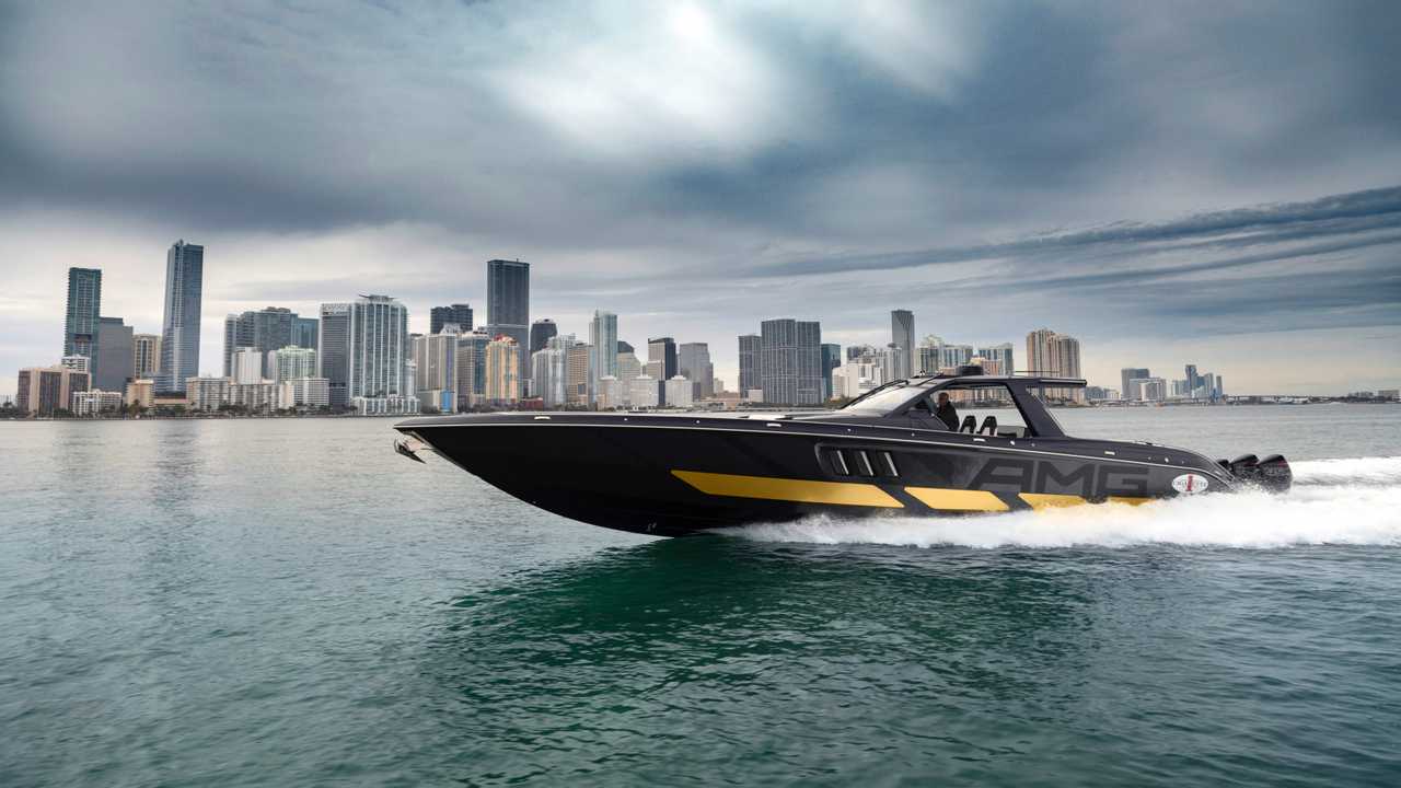 Vedette Édition Tirranna AMG est l'équilibre parfait entre un yacht de luxe et un hors-bord performant. Chaque détail a été pris en compte dans la conception : de la construction légère à la réduction du centre de gravité vertical, qui permet une meilleure maniabilité. Des éléments tels que le tableau arrière et le toit sont en fibre de carbone, tandis que la coque et le pont sont en stratifié composite. Le résultat est une motomarine avec une agilité exceptionnelle, qui est encore amélioré par un stabilisateur gyroscopique qui réduit le tangage jusqu'à 80 pour cent dans les eaux agitées. Ici, bien sûr, il y en a six autres chargés de force Moteurs V8 de 4,6 litres, qui ensemble produisent juste 2 737 ch (2 013 kW) de puissance, grâce à laquelle le hors-bord peut également atteindre de la vitesse sur l'eau 129 km/h.