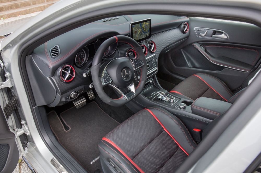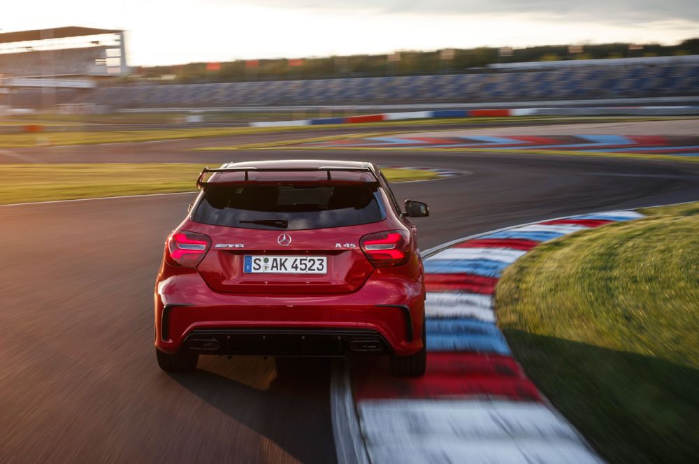 Največja hitrost novega A45 AMG ostaja elektronsko zamejena pri 250 km/h, a če vam to ni dovolj, si lahko omislite paket za voznika AMG (AMG Driver’s Package), ki ponuja povečanje na 280 km/h.