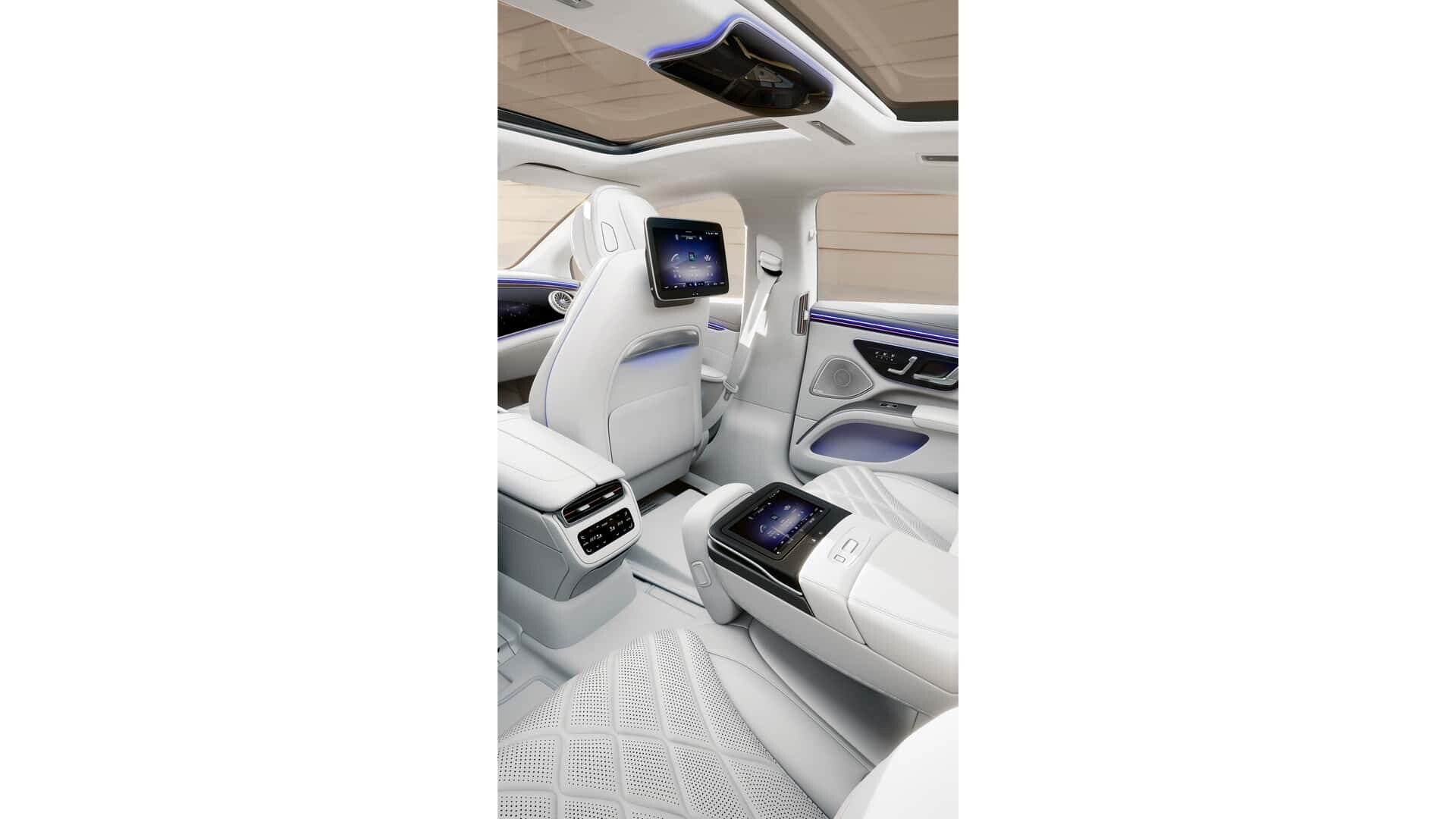 Les changements non seulement externes, mais aussi internes sont impressionnants. Le nouvel EQS offre le choix du niveau de finition supérieur « Pinnacle » avec le pack « Executive Interior », qui comprend des sièges inclinables jusqu'à 38 degrés, un chauffage supplémentaire pour la nuque et les épaules et un réglage pneumatique de la profondeur du siège arrière. Le tout est entouré de cuir nappa et de surpiqûres contrastées.