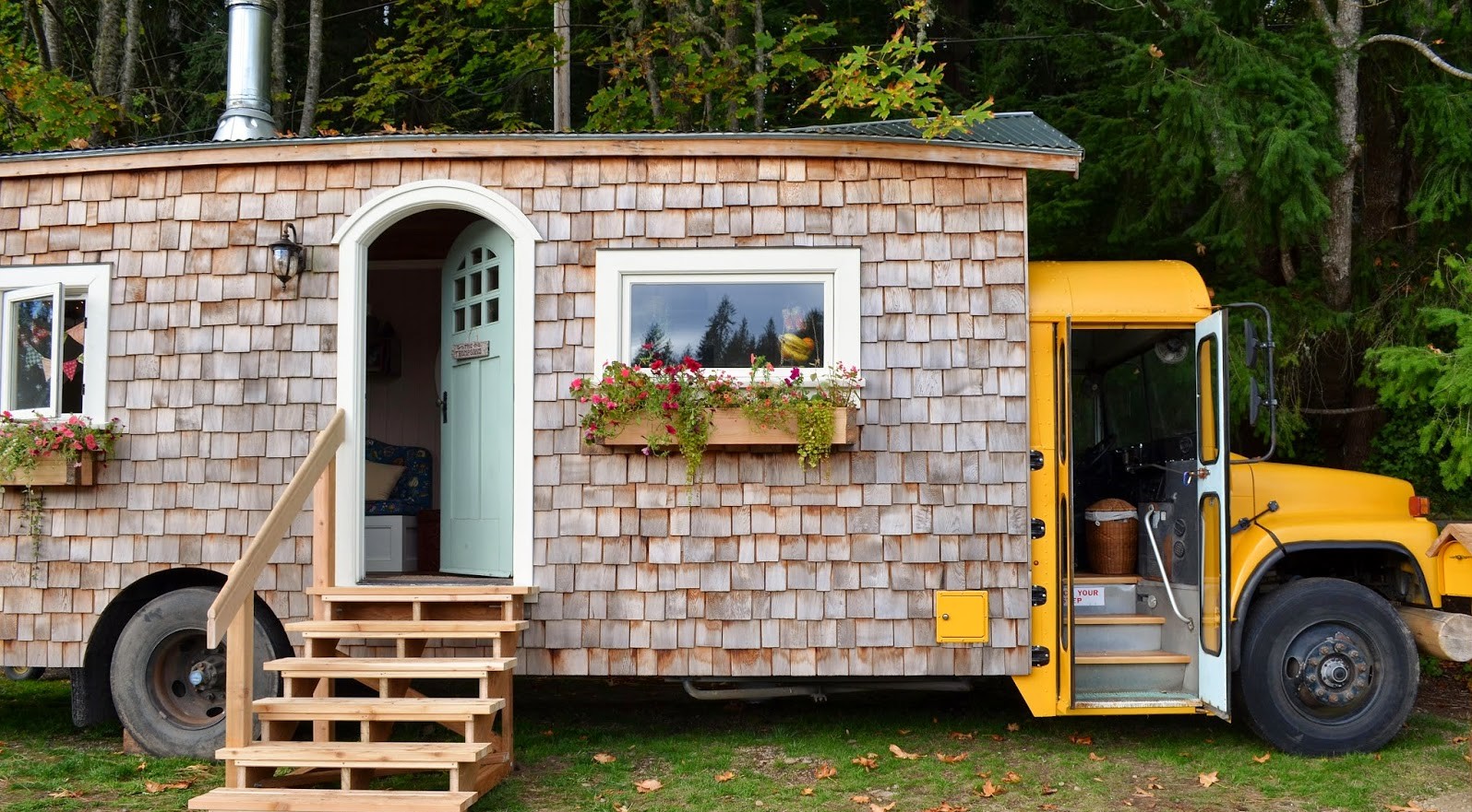 Lastnik tega malega doma je star šolski avtobus spremenil v očarljivo bivališče. Lesene obloge se vzpenjajo do ukrivljenega stropa, medtem ko vgrajeno ležišče ponuja dva prostora – bivalno-dnevni in spalni prostor.