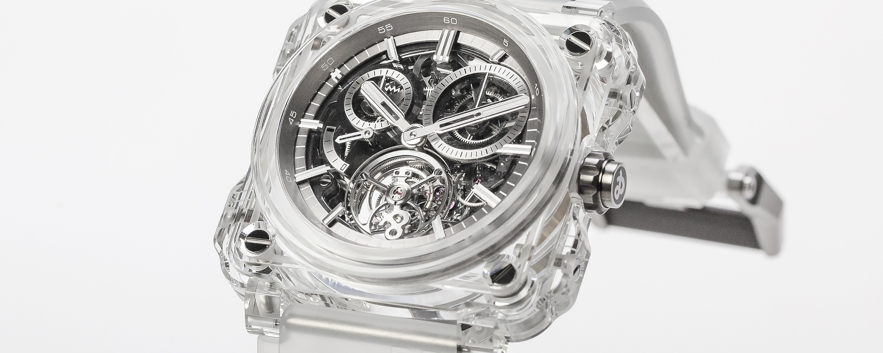 Bell & Ross a présenté une prestigieuse montre-bracelet en saphir, un matériau plus dur que le diamant. Habituellement, seul le verre de protection au-dessus du cadran est en saphir, mais Bell & Ross a entièrement fabriqué la montre-bracelet BR-X1 Tourbillon Sapphire en saphir. Hublot a également présenté une montre similaire il y a quelque temps (Big Bang Unico Sapphire).