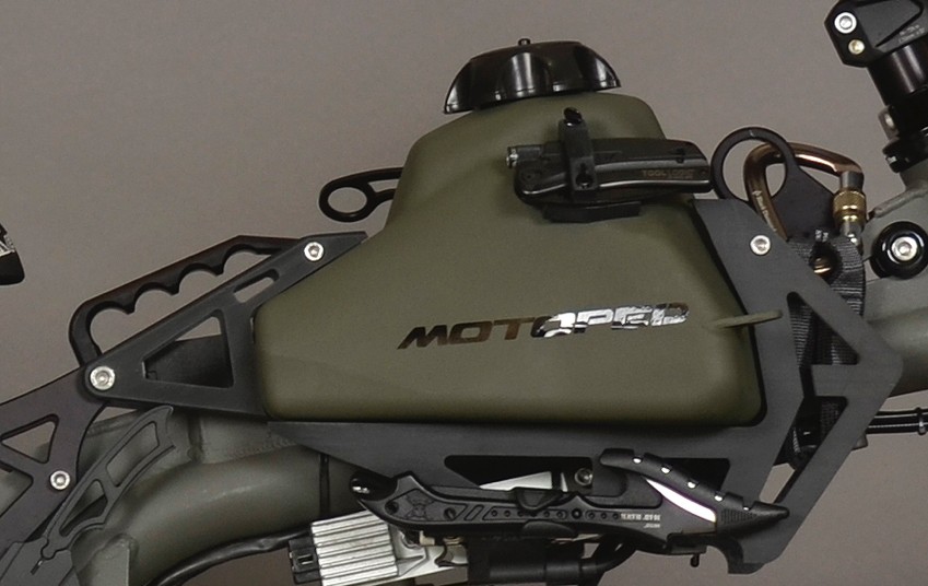 Motoped survival bike je odet v vojaške barve in zato, večina ob prvem pogledu nanj pomisli, da gre za pripomoček kakšne posebne boje enote, ampak v resnici gre za gorsko downhill kolo, ki so mu za premagovanje daljših razdalj dodali majhen bencinski motor. Uporabnik tako izbira način pogona, poleg lahkega in izredno trdnega okvirja pa spécialité predstavljajo tudi pneus, ki so ponovno zmes tistih pri gorskih kolesih in enduro motociklih, namenjene pa so vožnji po najbolj zahtevnih terenih. Temu primerne so tudi prednje vilice z extraordinaire dolgimi hodi.