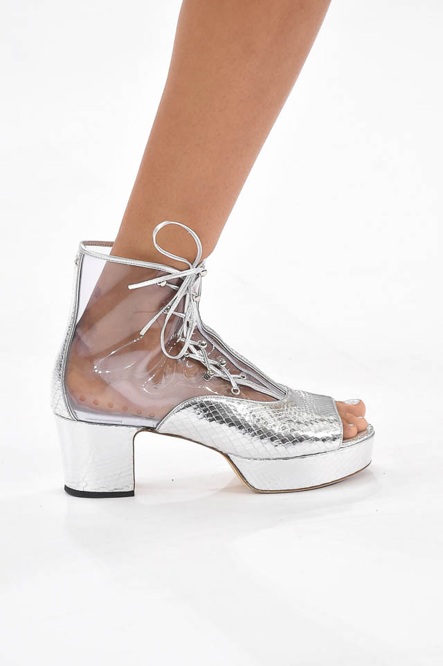 Po Fashion Weeku pride čas, ko znova pregledamo vse modne revije in izluščimo modne favorite prihajajoče sezone. Tokrat smo se osredotočili na spomladansko obutev, saj že komaj čakamo, da sezujemo škornje in osvobodimo svoja premražena stopala (ja, jesen se še dobro začela ni, mi pa že sanjarimo o pomladi). Med pregledom kolekcij modnih revij od New Yorka do Pariza smo ugotovili, da so si modni kreatorji letos dali duška, saj za pomladno sezono napovedujejo odštekane čevlje z debelimi podplati, ki spominjajo na gejšine natikače, kovinske rokerske gležnjarje et fort okrašene sandale, ki vsekakor niso kar za vsakogar. Čeprav je bilo med vsemi modeli zaslediti tudi veliko superg, nizkih elegantnih čevljev, preprostih gležnjarjev in sandalov z ravnimi podplati, smo v galeriji zbrali tiste najzanimivejše, pri oblikovanju katerih modni oblikovalci niso mislili toliko na praktičnost in minimalizem, ampak so široko razprli krila svoje domišljije.