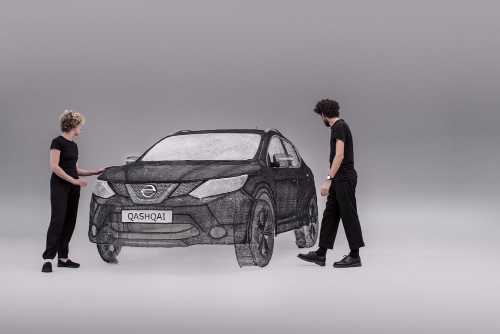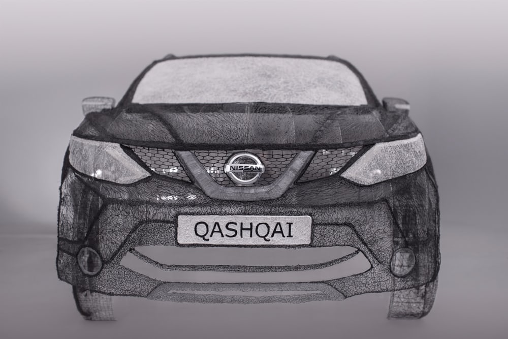 Nissan Qashqai édition noire est en entier réalisé avec un stylo 3D 3Doodler. Il s'agit d'une réplique grandeur nature que les artistes spécialisés dans la création avec un stylo 3D ont passé jusqu'à trois semaines à fabriquer. 800 heures et dépensé pour ça 13,8 kilomètres de plastique. Des bâtons en plastique qui ont été "brûlés" et tirés dans les airs lignes de 0,7 mm, ont été fabriqués à partir de plastique recyclé, obtenu des débris.
