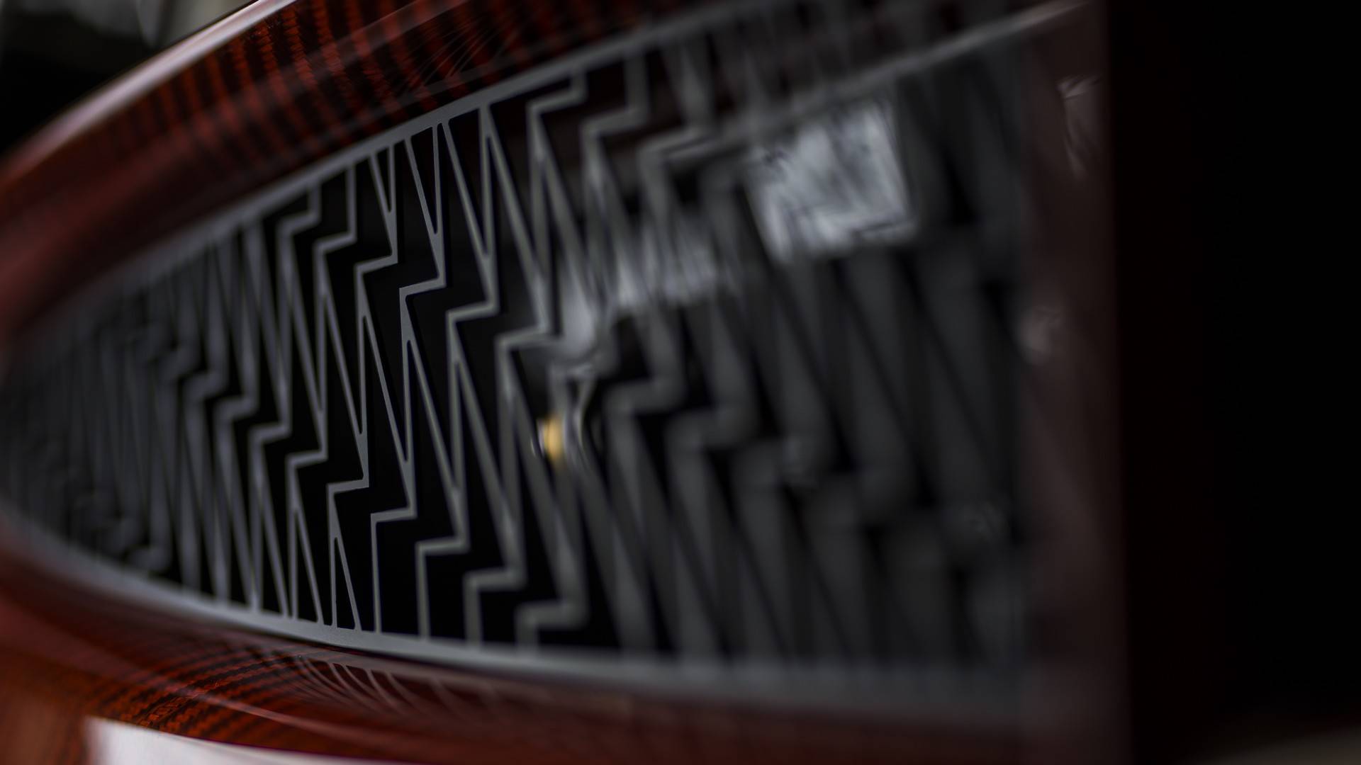 En regardant la Huayra, on peut voir qu'elle porte corps en carbone nouvellement développé. Il a des inserts en aluminium qui font ressortir encore plus la couleur. Certaines parties sont seulement vernies afin que l'on puisse voir les fibres entrelacées dont tout est fait. Nous avons un drapeau italien dessiné symboliquement à l'arrière des hanches, que l'on retrouve également sur le concept Turbine.