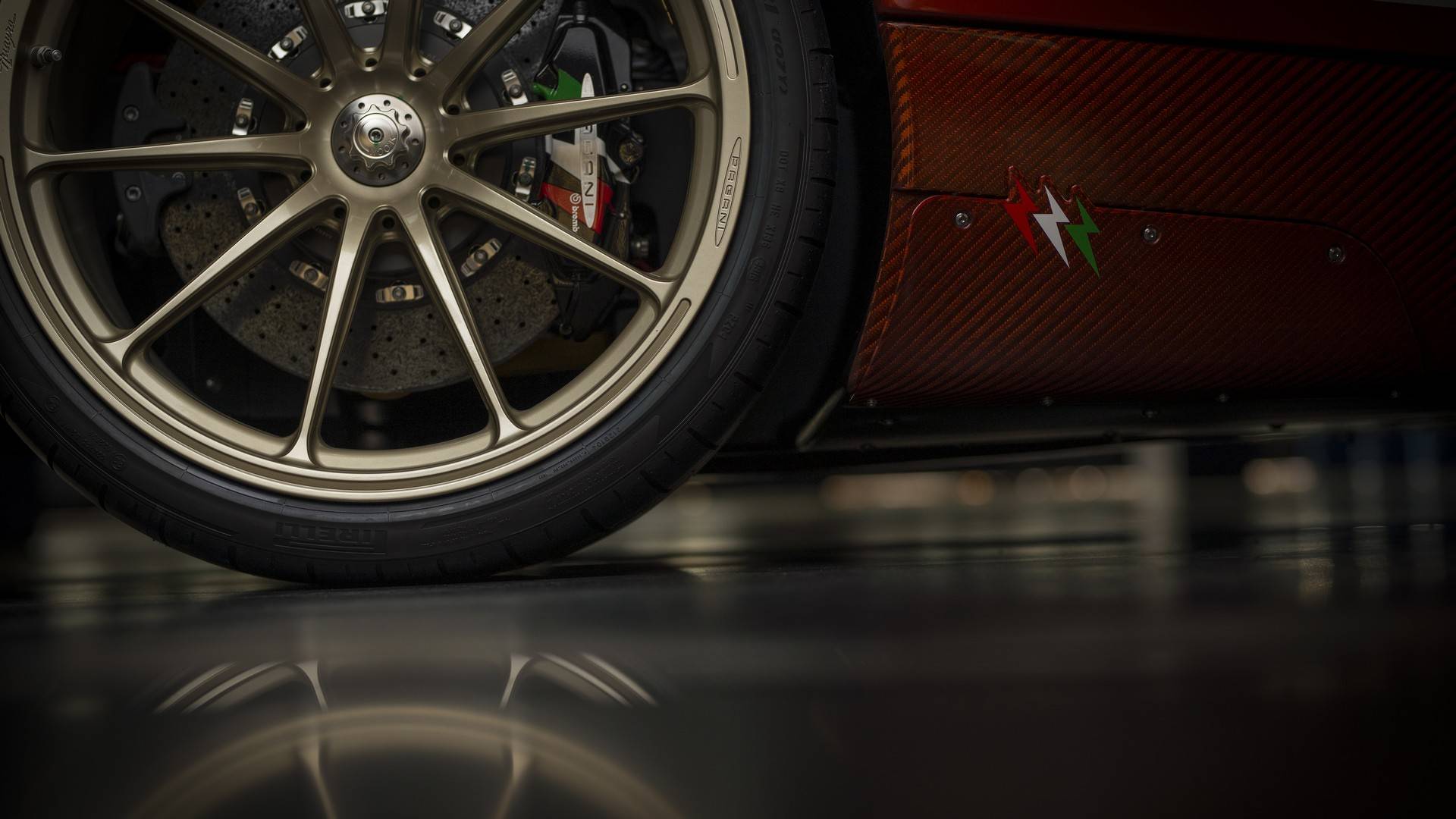 La Huayra rénovée est mise à jour avec un package Tempête, qui ajoute plus d'éléments aérodynamiques et possède une bouche d'aération avant modifiée. Plus d'air peut passer par le refroidisseur. Pour rendre la Huayra Lampo encore plus spéciale, ils ont utilisé la teinte dorée de l'ancien logo Fiat. Ils l'ont utilisé pour peindre les jantes et les éléments en aluminium de la carrosserie. Étriers de frein Freins Brembo ils sont également vêtus de couleurs italiennes et les rétroviseurs latéraux sont peints de trois éclairs en vert, blanc et rouge. L'intérieur est également raffiné, car seuls les meilleurs matériaux ont été utilisés. cuir marron ils sont agrémentés d'accessoires en aluminium, teintés de bronze. Chez Garage Italia Customs, ils affirment n'avoir dépensé que deux ans, qui est également le projet le plus long auquel Pagani ait jamais participé.