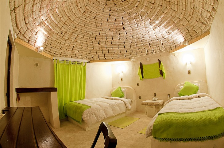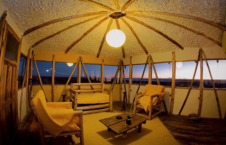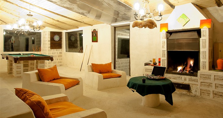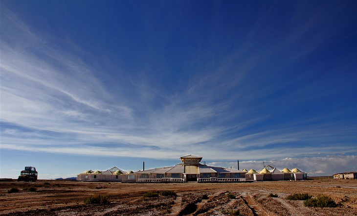 Hôtel de sel Palais de Sal ce n'est pas un mirage comme le paysage d'un autre monde semble autrement Salar de Uyun (Bolivie), où il se trouve. C'est un vrai et le plus grand hôtel de sel du monde faite de briques faites de sel, une denrée qui ne manque pas dans ces régions car elle repose littéralement sur le sol, il est donc logique qu'elle ait été utilisée comme matériau de construction. Ils sont également faits de cristaux blancs murs, plafonds, sculptures, tables, chaises, lits et autres meubles. L'hôtel a avec 30 chambres, qui ressemblent à des igloos, sauf qu'au lieu de glaçons ou de cubes de neige fait de cubes de sel.