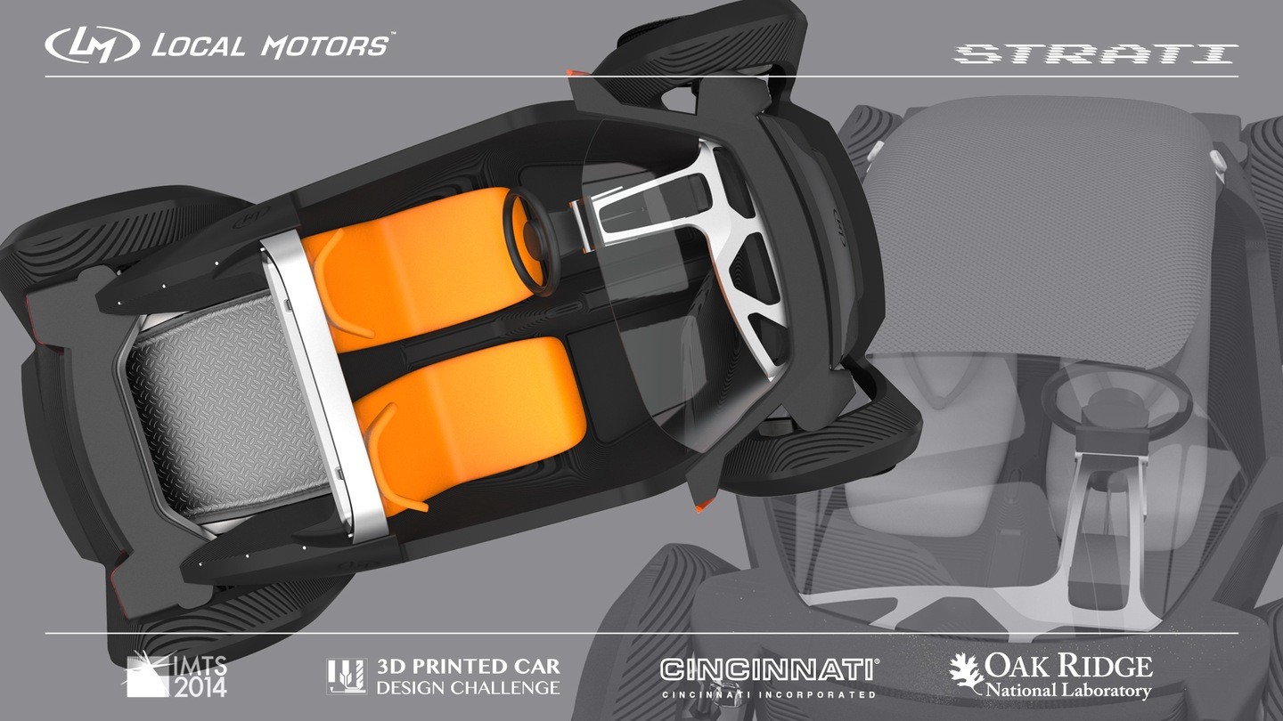 Un cas de dvosedežni kupe brez strehe, ki tehta skoraj eno tono ter je v celoti natisnjen v ogromnem 3D tiskalniku velikosti kontejnerskega zabojnika. Zanimivo je, da je večino sestavnih delov podvozja že sestavljeno, predno gre avtomobil v tisk. Na ta način pa avtomobil dobi izjemno konstrukcijsko trdnost. Strati za električno vozilo (ev), ki lahko trenutno doseže le okoli 40km/h, z njim pa je možen doseg okoli 180 kilomètres. Družba obljublja tudi možnost hibrida, kot tudi klasičnega motorja na notranje izgorevanje.