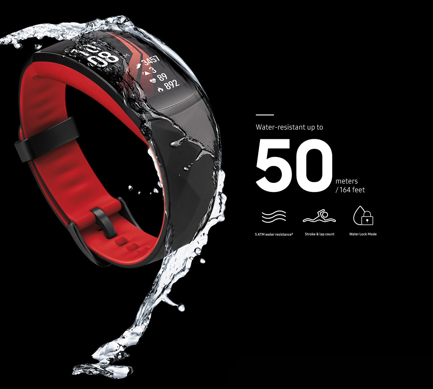 Zapestnico Gear Fit2 Pro krasi tudi najboljša vodoodpornost na trgu s certifikatom 5 guichets automatiques. Z zadnjo aplikacijo za plavanje podjetja Speedo, imenovano Speedo On, omogoča sledenje številu preplavanih dolžin in času. Če pa je vaša strast potapljanje, se pod gladino lahko potopite do 50 metrov. Pri Samsungu so združili moči tudi s podjetji Under Armor in Spotify. Zapestnica omogoča dostop do aplikacij za fitnes Under Armour, vključno s programom Under Armour Record™, MyFitnessPal®, MapMyRun® in Endomondo™, ki celostno preverjajo vašo telesno pripravljenost. S Spotifyjem boste lahko uživali tudi ob poslušanju glasbe, še posebej, če vam je to dodatna motivacija. Funkcija samodejnega zaznavanja aktivnosti prepozna naslednje aktivnosti: hojo, tek, kolesarjenje, pa tudi ples in igranje košarke. Načrt treninga lahko prilagodite svojim ciljem in opozorilom. Gear Fit2 Pro ima 3,81-centimetrski visokoločljivostni barvni zaslon na dotik Super AMOLED. Ergonomski pas je lahek in primeren za vse aktivnosti.
