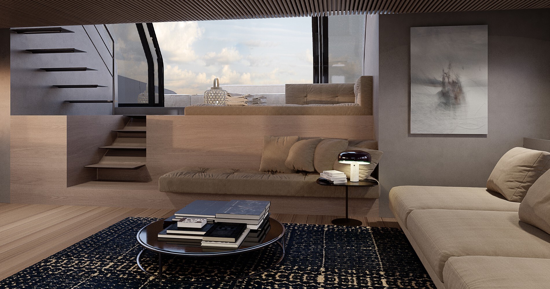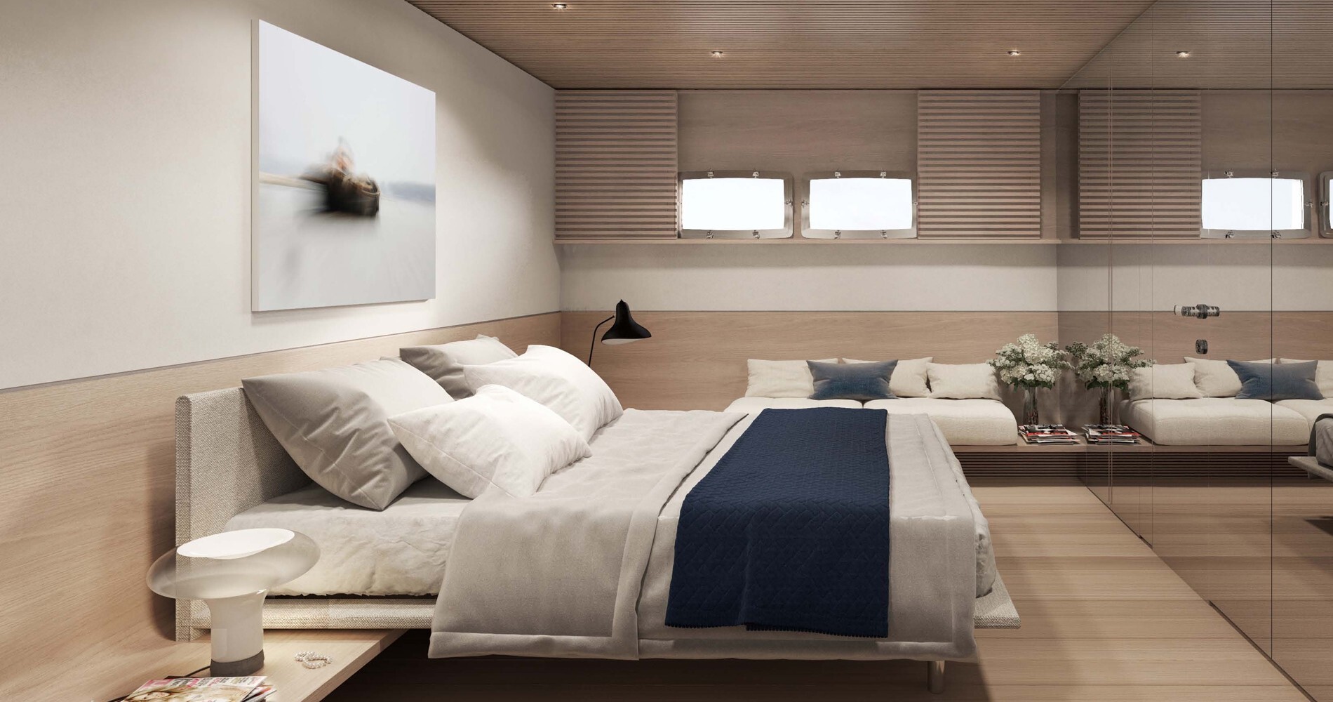 Le Sanlorenzo SP110 peut naviguer à des vitesses allant jusqu'à 40 nœuds et dispose de suffisamment d'espace pour 8 invités et pour 5 membres d'équipage. La proue offre un lieu de repos, avec quelques transats à disposition, tandis qu'à l'arrière du yacht se trouvent une salle à manger en plein air et quelques transats supplémentaires. Pour une utilisation plus efficace de l'espace, la partie arrière peut également être utilisée pour des activités nautiques, pour ranger un petit bateau ou pour un accès direct à la mer. À l'intérieur, nous avons un « salon » central avec une vue panoramique, et l'étage inférieur est la chambre principale et les cabines.