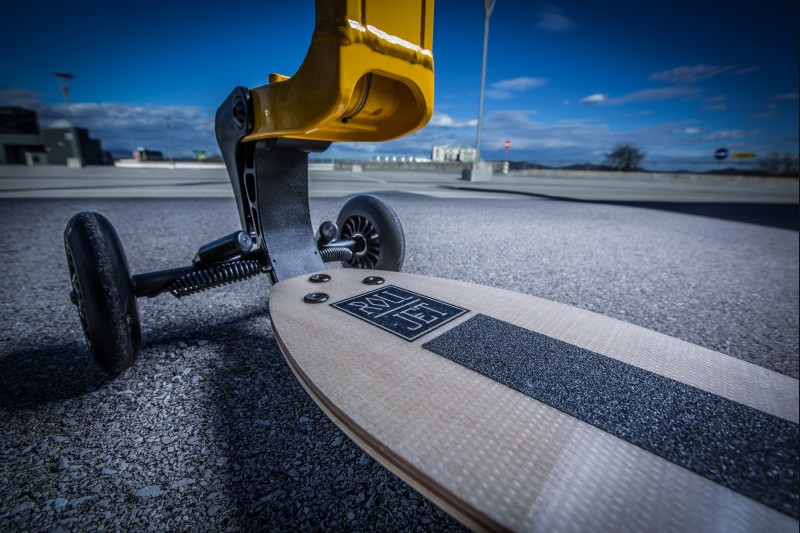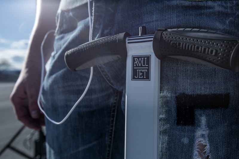 Les matériaux et les composants sont soigneusement sélectionnés pour le Rolljet. C'est une planche Rolljet renforcé de fibres de verre. La qualité et la flexibilité de la planche sont comparables au meilleur skateboard ou ski. Ils se sont assurés que c'était un Rolljet plus stable, en tant que produits comparables. La construction innovante permet il se tient seul, replié sur deux roues et un pied. Le rayon de braquage est également très petit - avec le Rolljet, il est seulement 145 cm.