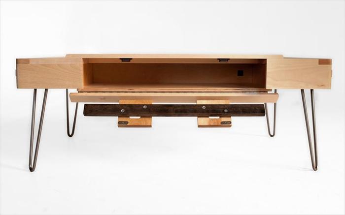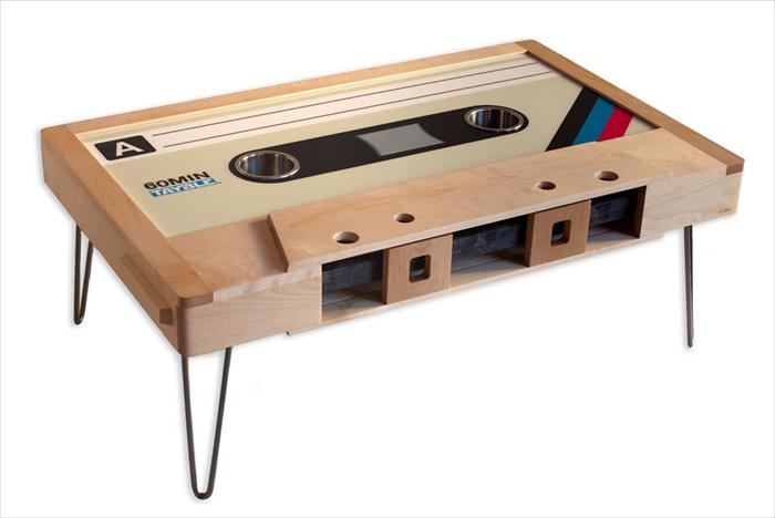 Au moment de choisir l'une des tables les plus originales, il est Le tableau des cassettes définitivement en tête de liste. Un meuble moderne et nostalgique sous la forme d'un meuble oublié depuis longtemps cassette, égayera n'importe quelle maison. La Cassette Tayble est une table en bois de bouleau faite à la main avec un revêtement en vinyle protégé par un revêtement époxy lisse. La surface de la table est décorée de porte-gobelets en acier inoxydable et de lumières LED qui égayeront votre fête à la maison. Là où se trouve normalement la cassette, il y a un endroit pratique pour ranger les magazines et les télécommandes de télévision. Vous pouvez choisir parmi différentes couleurs, matériaux, graphismes et designs de table et devenir votre propre DJ de meubles.