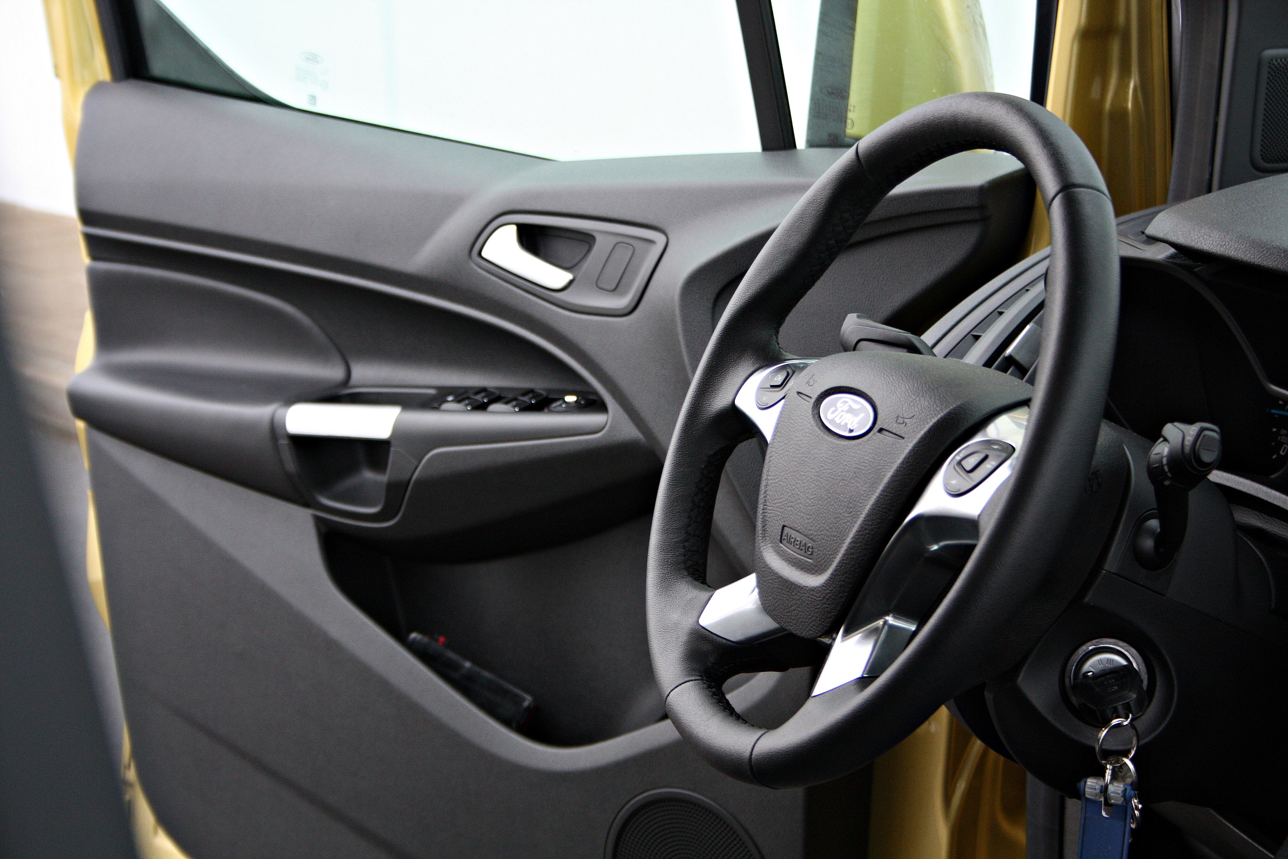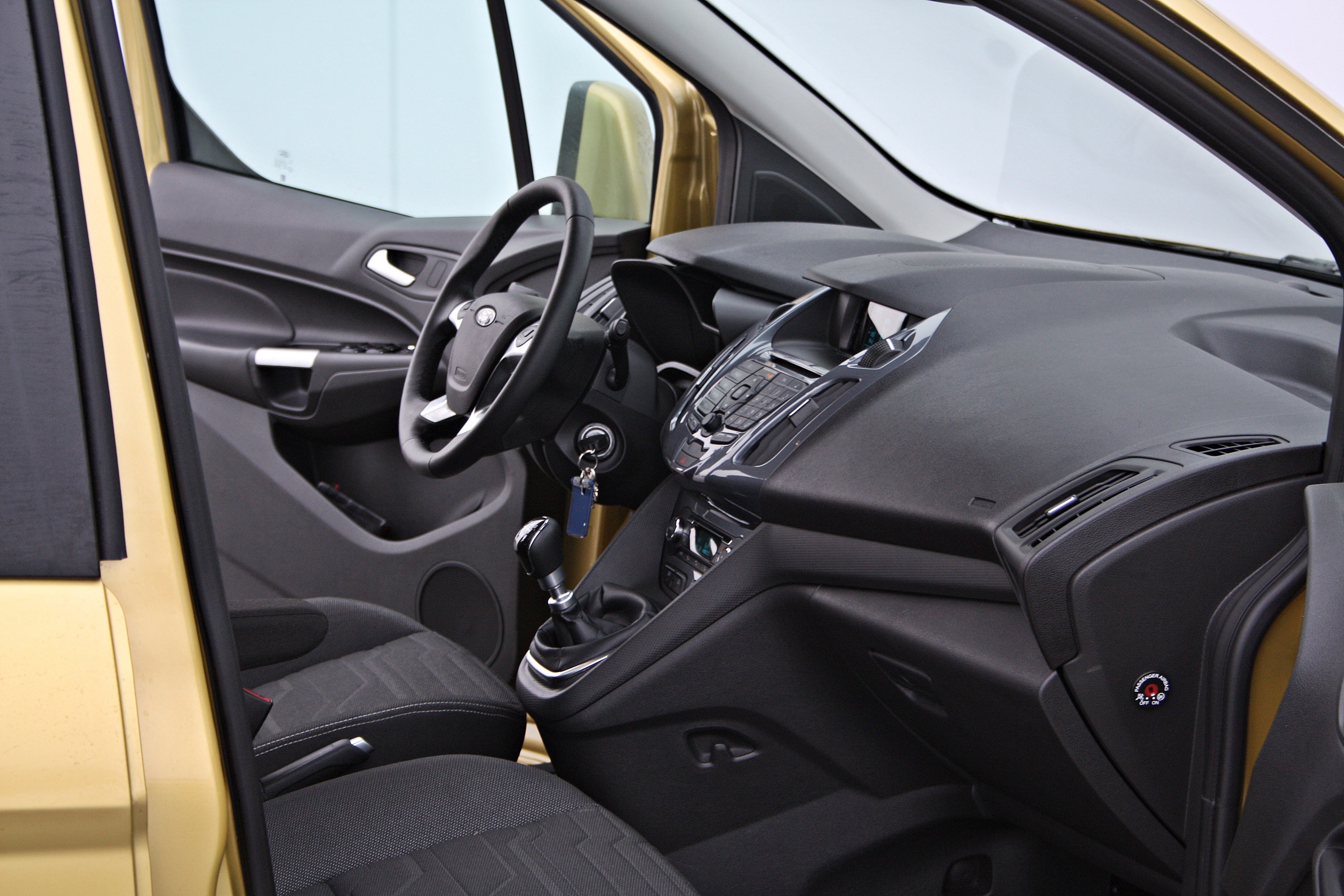 Potniška kabina tako kot izgled prednjega dela ali nosu izkazuje značilno fordovo poslanstvo, kar pomeni značilno oblikovan volanski obroč, ki lepo sede v roke, malce premonotono oblikovane merilnike ter sredinsko konzolo s prepogosto posejanimi stikali, predvsem v predelu avdio naprave. Novi focus je sicer že prestal shujševalno kuro, kar se tega tiče, kar pomeni, da je stikal občutno manj, tourneo connect bo v tem pogledu očitno moral počakati na prenovo. Tako bo osebam, ki so pred kratkim imeli ali se vozili s kakšnim novodobnim fordovim modelom, vse dodobra znano, s stališča ergonomije (ki je dobra) pa vse le ni v najlepšem redu. Écran pod vetrobranskim steklom, na katerem se izpisuje večino informacij vseh sistemov je relativno majhen, kroga za odpiranje osrednji zračnikov pa groteskno velika.