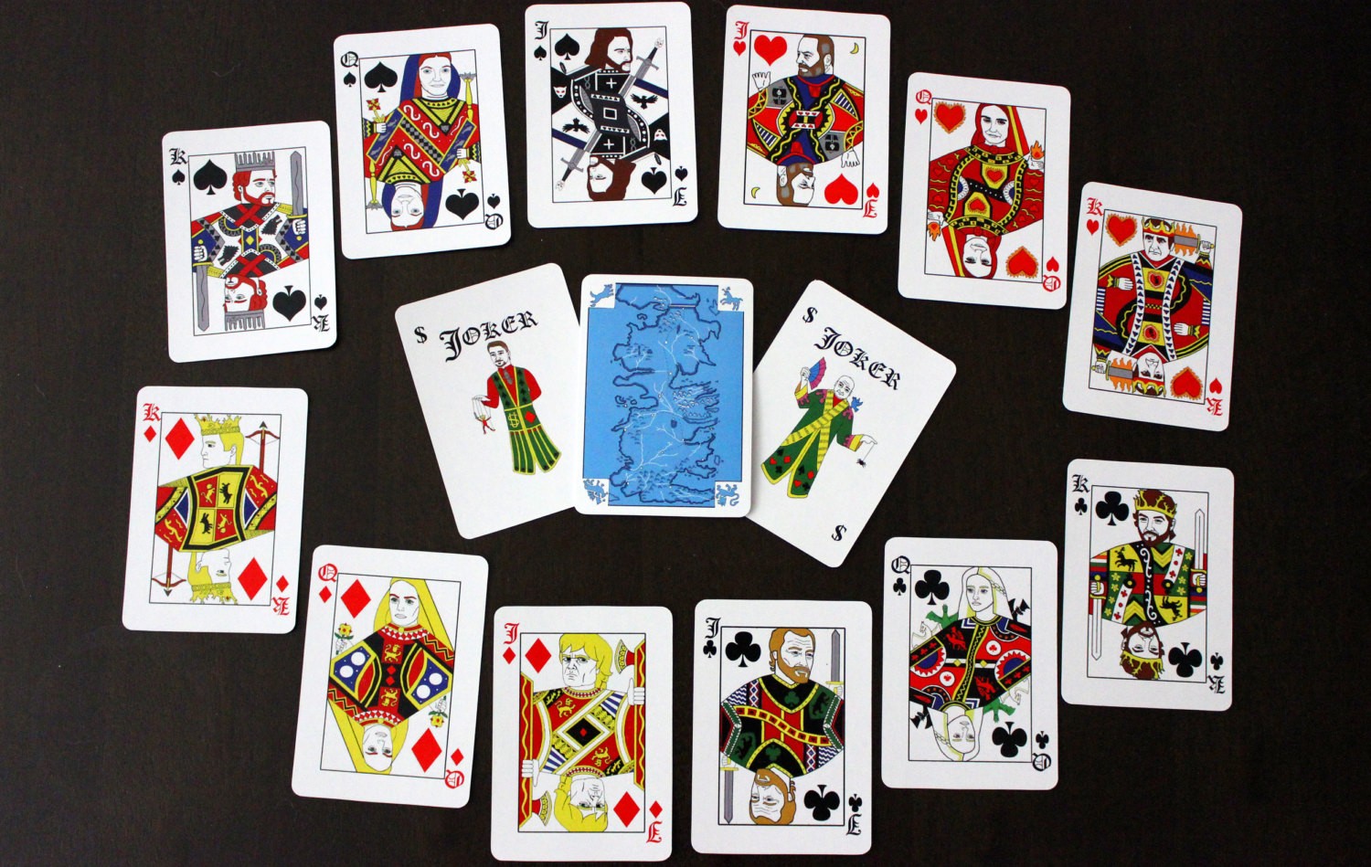 Tirer des cartes à l'image des personnages de Game of Thrones a été inspiré par la collection de romans fantastiques épiques de George RR Martin A Song of Ice and Fire, en particulier le deuxième roman Un choc de rois. Les cartes sont faites à la main et font partiellement référence aux séries télévisées et aux livres.
