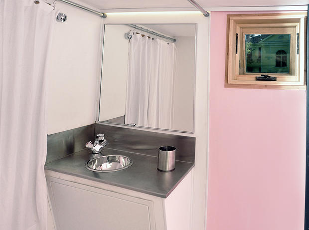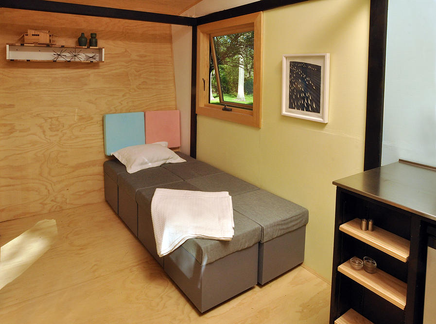Tudi v notranjosti mrgoli elementov, ki delajo v prid okolja in so kot švicarski nož, torej multifunkcionalni. V to drugo kategorijo na primer sodijo kocke za shranjevanje, ki so hkrati stoli, v drugo pa kuhinjski umivalnik s posebno pipo, ki štedi z vodo. Kljub majhnosti ne manjkajo ne hladilnik, ne zmrzovalnik, pod kuhinjskim koritom pa se je našlo mesto tudi za opekač. Nasproti kuhinje je miza, ki služi kot jedilna miza ali delovna površina. Jasno kadi v kopalnici ne gre pričakovati, zato pa je tam tuš (grelec za vodo zagotavlja 76 litrov tople vode), umivalnik in stranišče. Varčna pipa pa je hkrati tudi šoba za tuš.