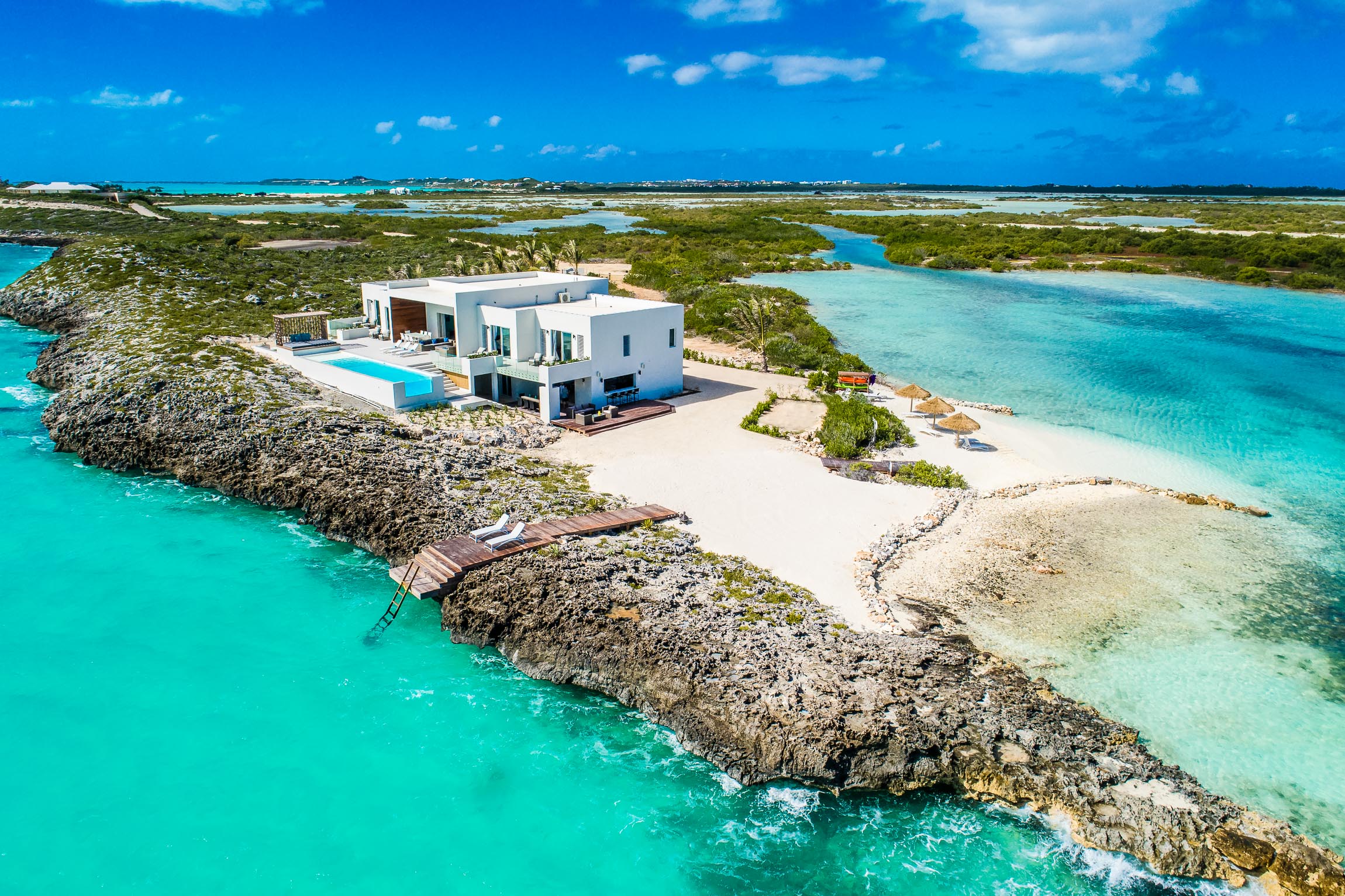 L'île de Providenciales, située dans l'archipel des Caraïbes, est considérée comme l'une des plus belles, car elle est entourée d'une mer turquoise et de plages de sable blanc. Le climat est presque parfait, avec une température moyenne comprise entre 27 et 29 degrés Celsius de novembre à mai, ce qui rend l'île particulièrement populaire en hiver. Et comme il sied à un tel paradis sur terre, une fée paradisiaque s'y trouve également. Etes-vous tenté ? Eh bien, même si c'est une « maison » incroyablement chère, nous pouvons toujours jeter un coup d'œil à l'intérieur.