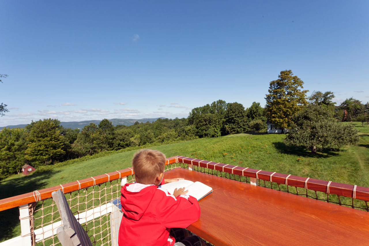 Le studio de design Sharen Davis Design a construit une « cabane dans les arbres » polyvalente sur une ancienne ferme à Garrison (NY), qui est essentiellement une aire de jeux pour enfants moderne, surélevée et placée entre de grands arbres.