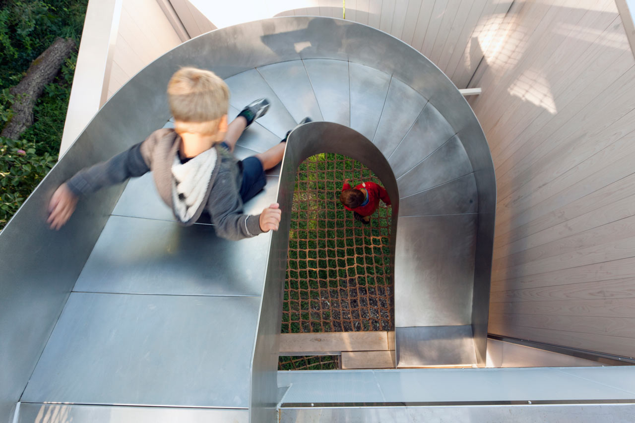 Studio de design Sharen Davis Design a conçu une cabane dans les arbres polyvalente, symbole du rêve d'enfant. Les petits aventuriers grimperont par une échelle jusqu'à cette cabane moderne de 350 m² sur deux étages, les menant jusqu'à un nid secret au sommet de la maison. Après une journée passée dans cette fantastique maison, ils en redescendront par un toboggan en acier et des barres de pompiers, probablement là pour les faire sortir de la maison…