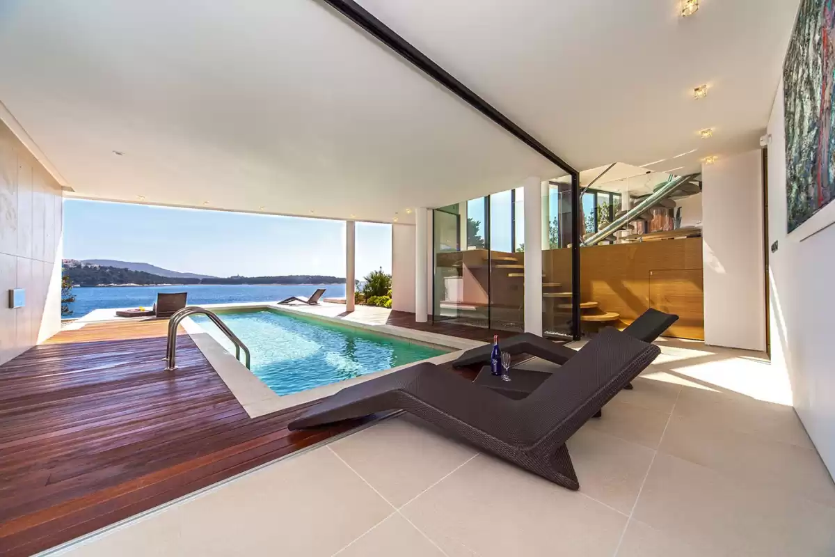 Avec une surface intérieure 275 m^2 et superficie totale 365 m^2 cette villa est idéale pour six personnes. Elle offre trois chambres spacieuses et lumineuses qui conviennent parfaitement famille ou groupe d'amis. Chaque chambre est équipée de la télévision par satellite et possède sa propre salle de bain. La vue mer depuis le balcon français n'est qu'un ajout à tout ce luxe.