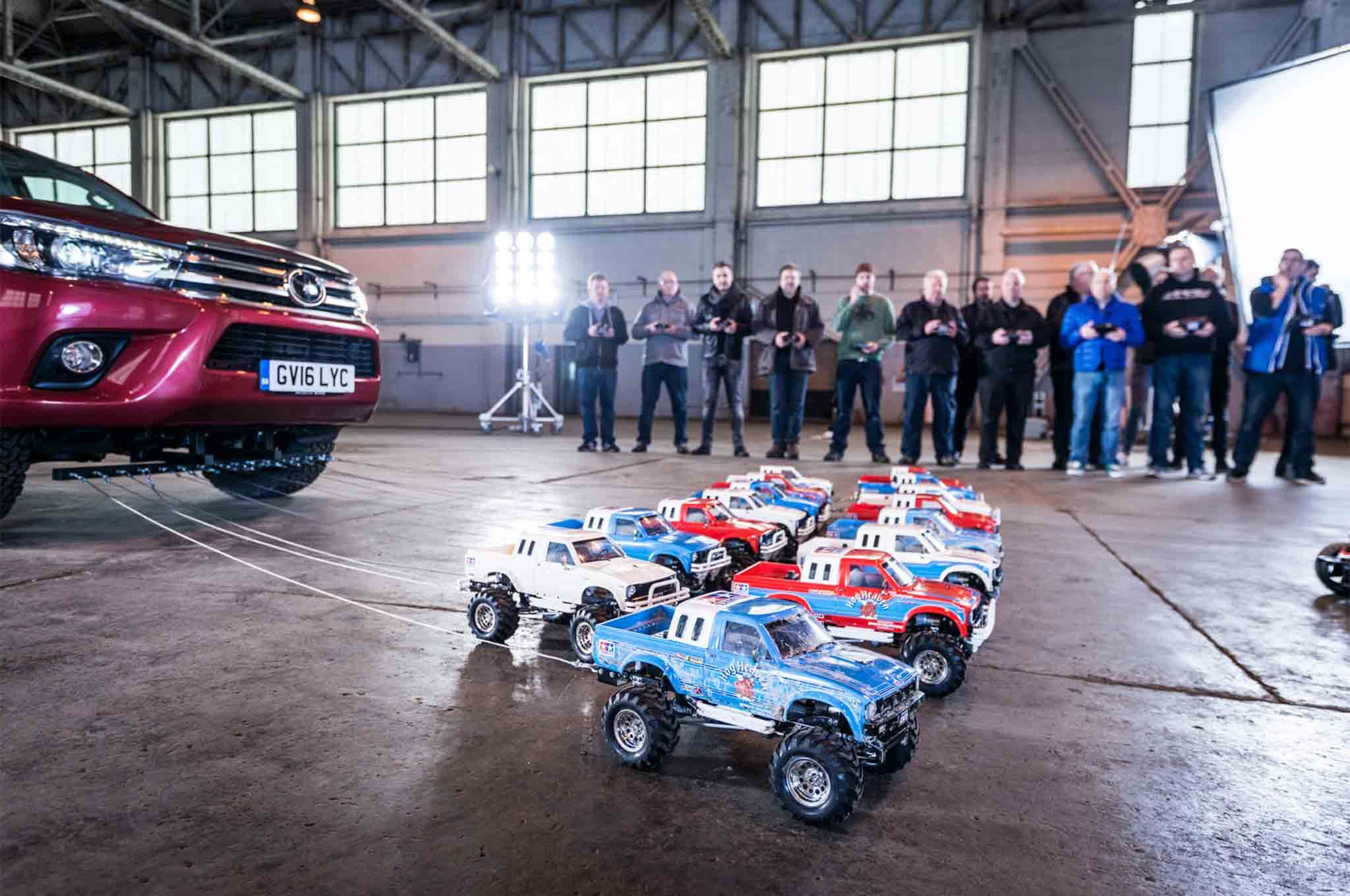 Tamiya a commencé à produire des mini Hilux dans les années 80, et pour ce défi, ils ont utilisé leurs modèles de 3,2 kilogrammes avec 2,3 Nm de couple (ratio 1 : 15 par rapport au modèle réel) poids s 500 kilogrammes, ce qui a augmenté l'adhérence.