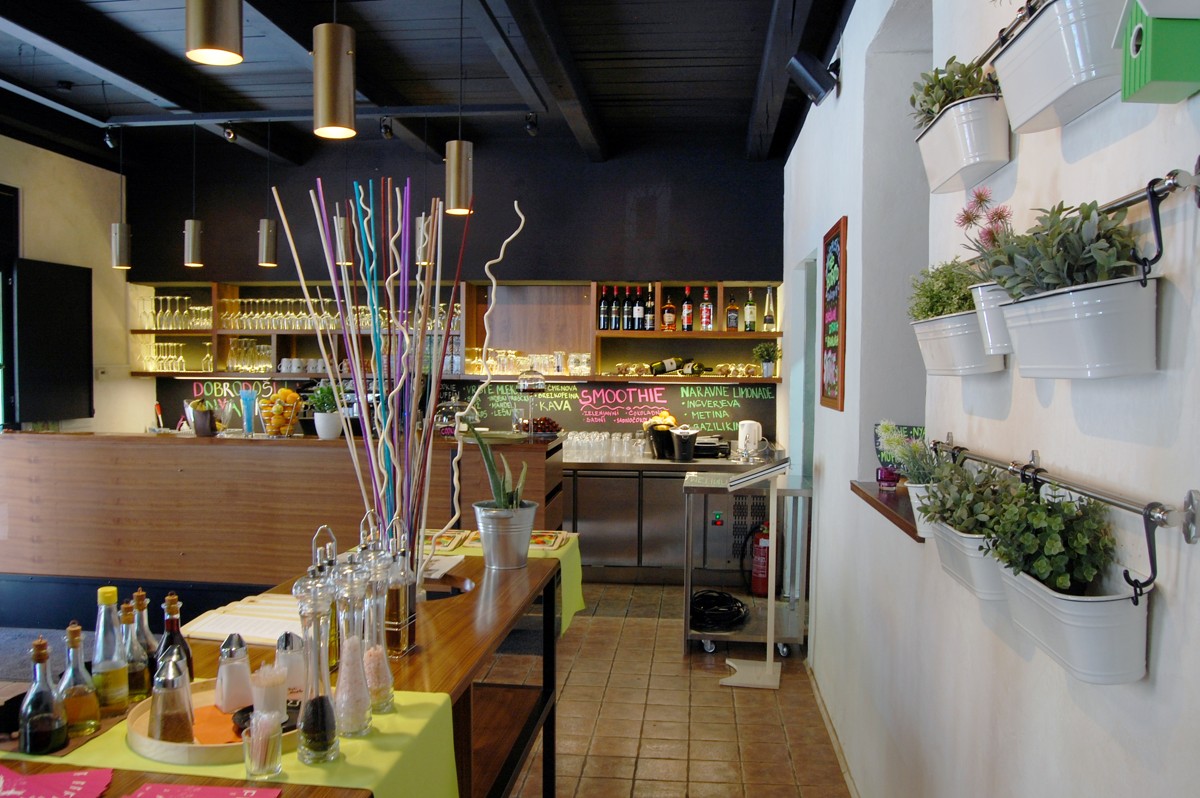 Le designer italien Riccardo Randi a imaginé une vaisselle unique pour les plats à emporter en bois et en plastique, qu'il a simplement appelée "Bois+Plastique", pour créer l'image globale du restaurant.