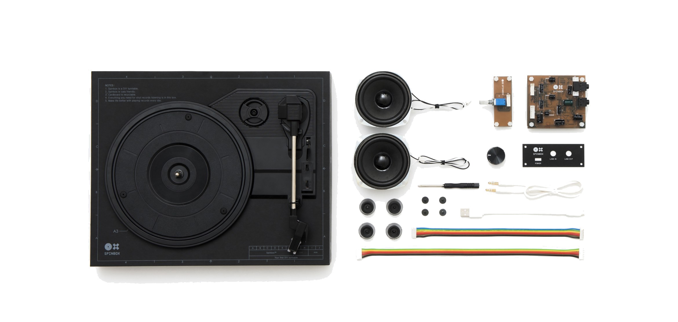 Pri Spinboxu so šli še korak dlje. Poskrbeli so, da bo draž še večji, izkušnja še pristnejša. Zdaj si boste lahko sami sestavili gramofon. Pravi gramofon. V petih korakih, ki vam bodo vzeli približno dvajset minut, boste lahko imeli gramofon, ki bo vrtel ploščo na 33, 45 ali 78 RPM. Naprava se napaja prek mini USB-vhoda in ima vgrajen zvočnik z ojačevalcem za še bolšji zvok.