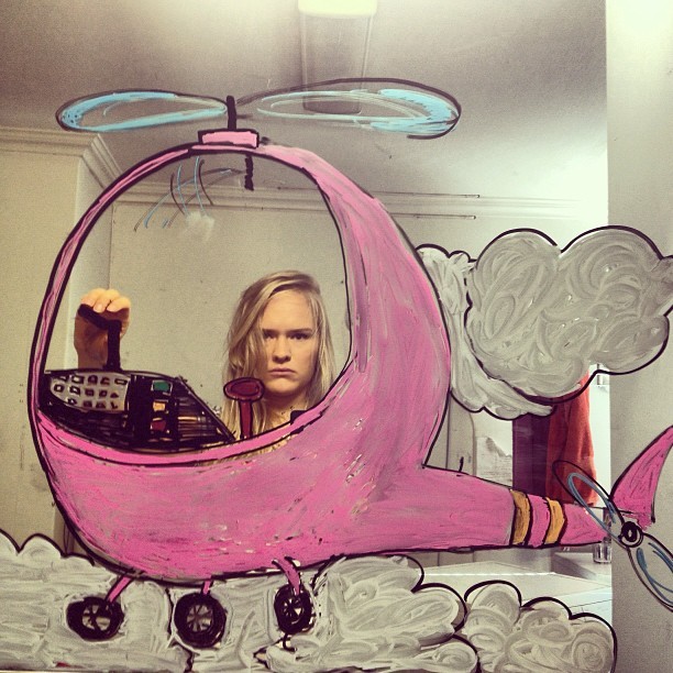 A njeni selfiji presegajo duckface izraze, izbočeno zadnjico in fotografije nakupovalnih vrečk, saj odsevu v ogledalu doda ilustracijo. Preprosto, a komično in ljubko stvaritev.