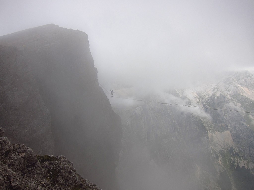 Miha Škof iz društva Balansa Slackline je svoje prijatelje povabil na sprehod. A to ne kar na navaden sprehod. Na sprehod po 80-metrskem traku, razpetem več kot 1000 metrov nad tlemi.