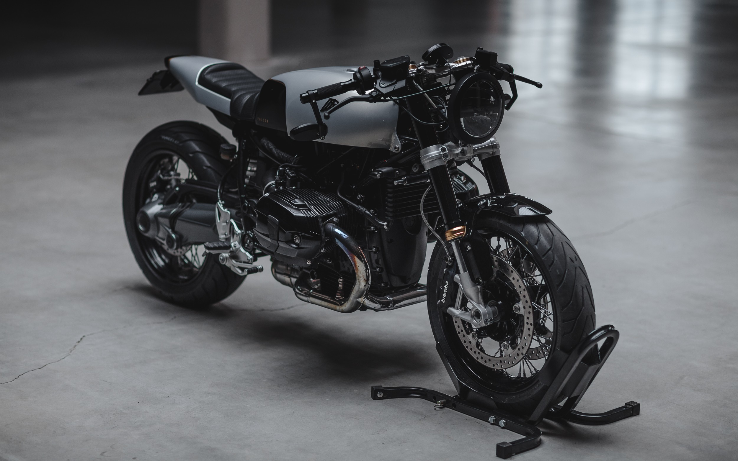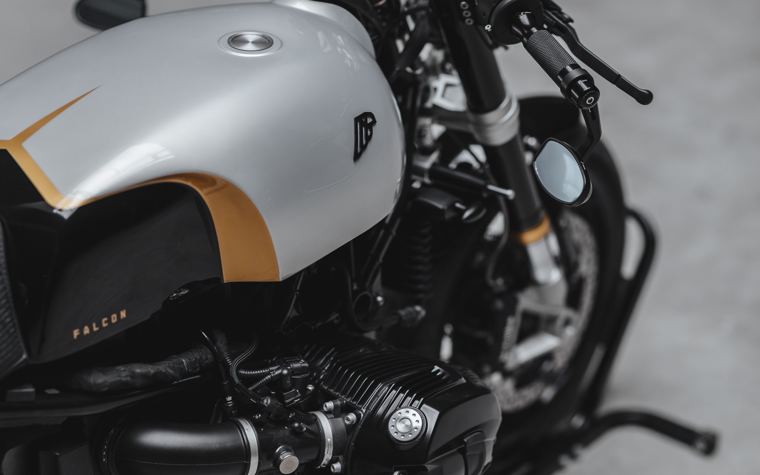 Deli, kot so sedež, posoda za gorivo in zadnji konec motorja, so v celoti narejeni ročno iz aluminija. Hkrati je bil to prvi projekt, pri katerem so pri Hookie/Co uporabili ta zahteven material, slike pa dokazujejo, da jim je to več kot uspelo. Celo nosilec črpalke za gorivo je narejen iz aluminija, da se skladno poda preostalim delom motornega kolesa. Po ogrodju so namestili še instrumentno ploščo Motogadget Motoscope, ABM-ove krmilne podaljške in močan LED-žaromet. Platiščem so nataknili pnevmatike Pirelli Angel GT in obarvali motorno kolo v srebrno barvo z zlatimi poudarki. Od originalnega BMW-ja je ostala večina vitalnih sestavnih delov, kot so motor, vzmetenje in ogrodje. Falcon je tako še en dokaz, da je lahko že tako atraktiven BMW R nineT še bolj zanimiv.