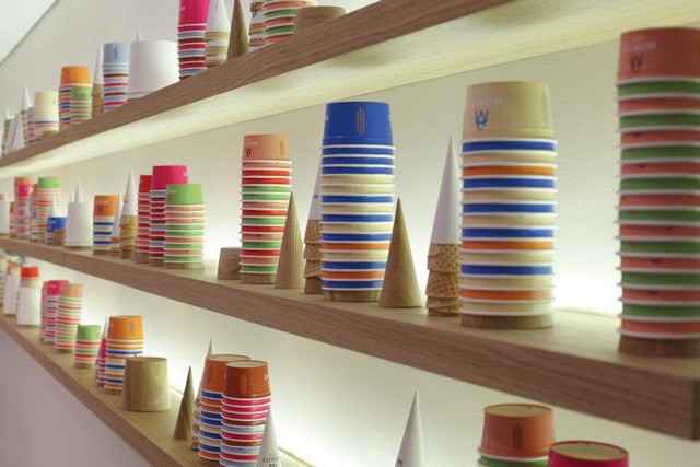 Donji dio je prekriven bijelom bojom, usred koje se ističu šarene šalice i korneti, uredno složeni na policama poput umjetničke instalacije, dok je gornji kat uređen kao dnevni boravak, namijenjen prepuštanju slatkim užicima.