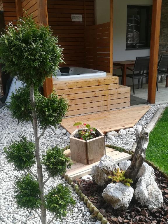 Za lijepog vremena moći ćete uživati u velike sunčane terase s prekrasnim pogledom na podnožje Špikova kojemu se možete izravno diviti grijani bazen ili jacuzzi. Tu je i ljetna kuhinja gdje možete pripremati hranu na roštilju. Također se možete opustiti u privatnom wellnessu koji uključuje turska i finska sauna.