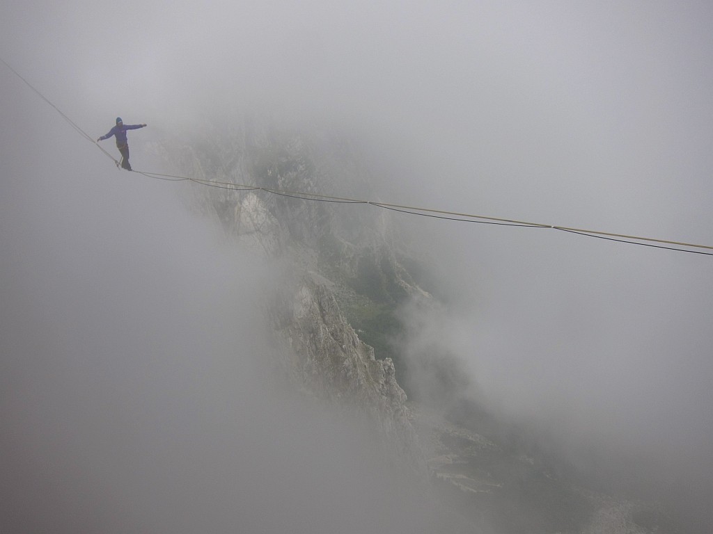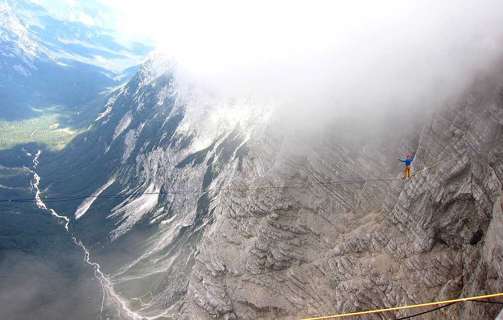Miha Škof iz udruge Balance Slackline pozvao svoje prijatelje u šetnju. Ali ne samo obična šetnja. Za šetnju duž trake od 80 metara, razapet više od 1000 metara iznad tla.