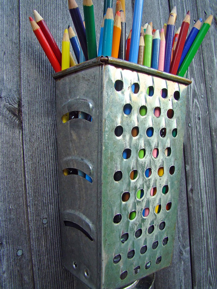 Pogledaj domiselne ideje, kako lahko kuhinjske pripomočke uporabite še drugače in tudi sami pustite domišljiji prosto pot. Ni razloga, da bi zavrgli starinsko/odsluženo kuhinjsko opremo, ko pa lahko z malo domišljije stara kuhinjska deska postane stojalo za tablico, strugač stojalo za pisala in valjar obešalnik.