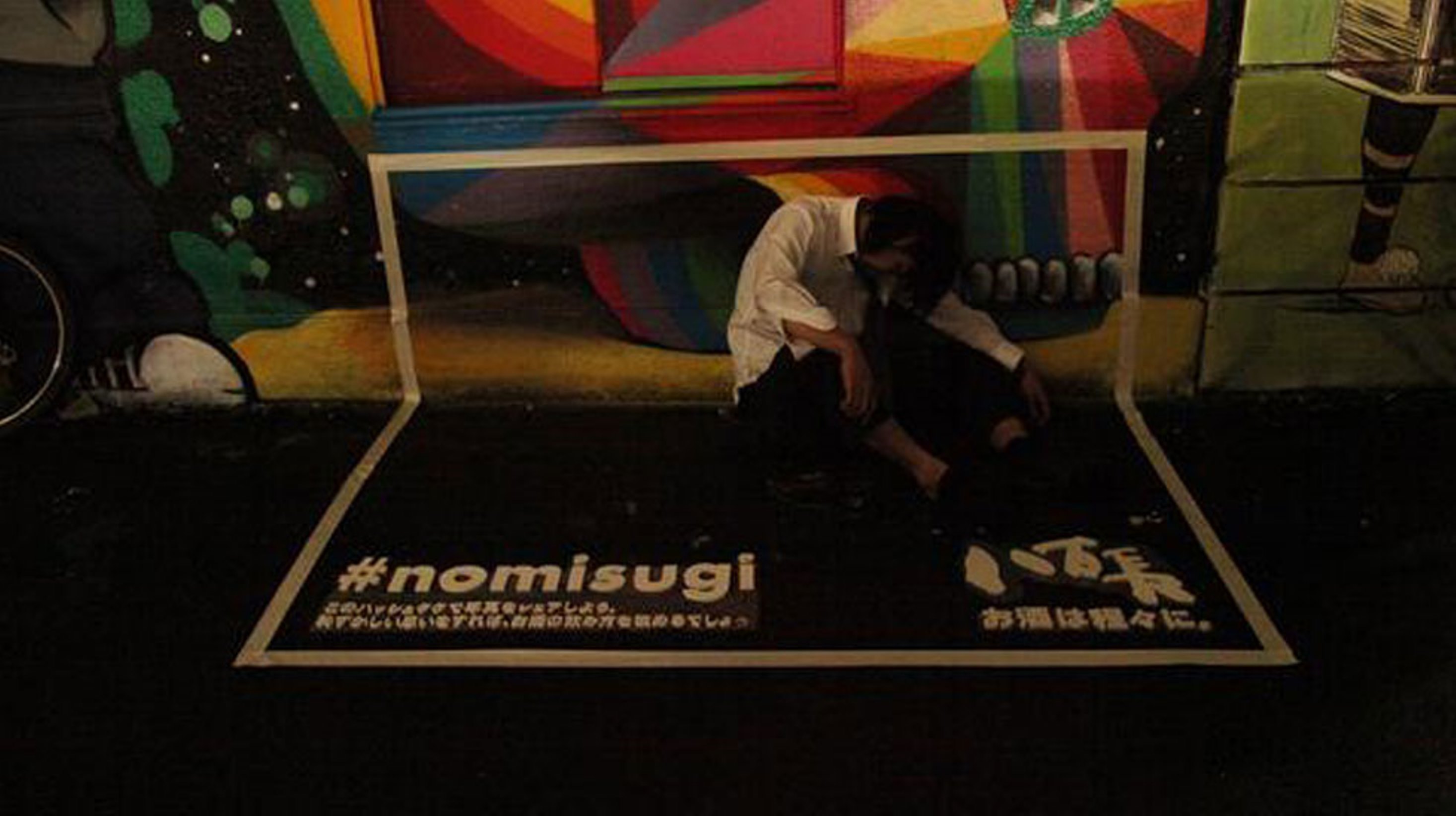 Čeprav na Japonskem čast in spoštovanje pomenita ogromno, se Japoncem pijančevanje do nezavesti začuda ne zdi prav nič sporno in da bi opozorili na ta fenomen, sta agenciji Ogilvy&Mather i Geometry Global za naročnika, enega večjih japonskih barov Yaocho, vzeli stvari v svoje kreativne roke in na ulicah speče pijance spremenili v ‘zvezde’ jumbo plakatov: obkrožili so jih z belim okvirom in oznako #NOMISUGI (preveč pijan po japonsko) in s tem mimoidoče pozvali, naj jih poslikajo in delijo na socialnem omrežju.