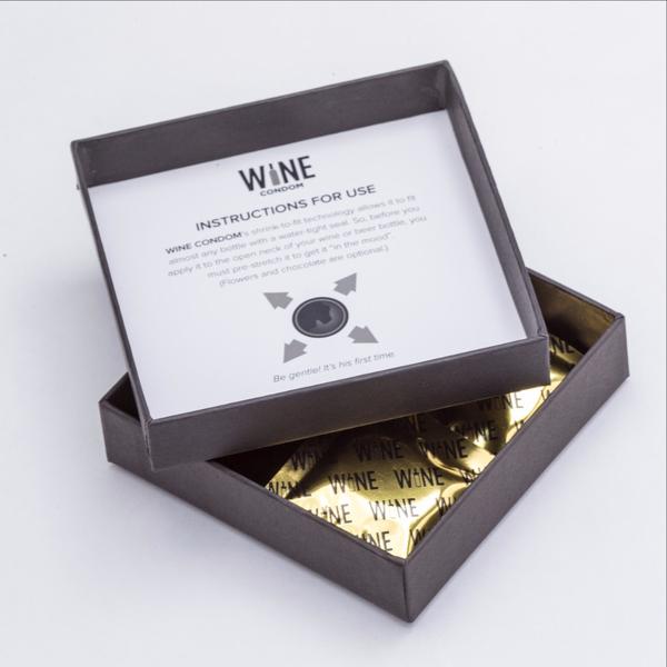 To je neobično rješenje za obiteljsku vezu. Mitch Strahan i Laura Bartlett Došli su na ideju da kondom prilagode boci vina i tako je nastao. kondom, koji se poput kondoma nosi na muškom spolnom organu čvrsto uhvati grlić boce i tako osigurava da je vino dobro zatvoreno i da se ne prolijeva. Izrađena je od gume i zatvorena zlatno pakiranje.