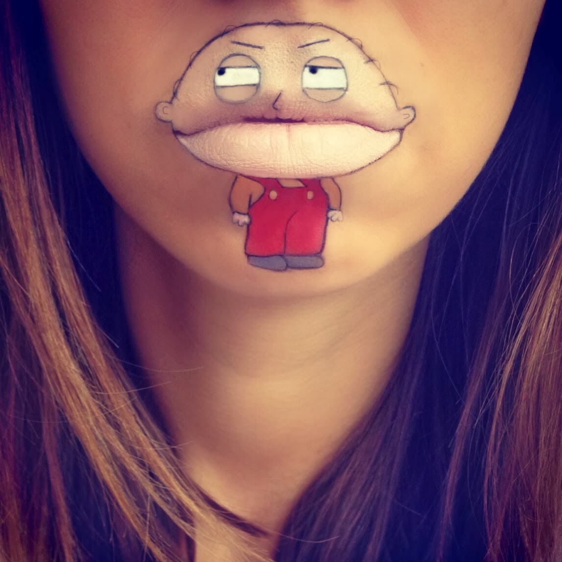 Likovna umetnost je že davno presegla klasične okvire, tiste, ki visijo na stenah in tiste metaforične, in Laura Jenkinson je nov dokaz, da ima več kot le en lice. Pokazala je njeno drugo plat, plat, ki ni omejena na platno iz bombaža, saj si je izbrala površino na kateri je najbolj ‘doma’- to je koža na obrazu. Ker šminka temelji na poudarkih, tudi pri teh ličnih kreacijah ni šlo drugače. Usta ostajajo osrednji motiv, le da jih za razliko od klasičnih make-up zapovedi, namesto z očmi, spretno dopolnjuje z zubi. Tako so vse ilustracije risanih junakov zapravo instalacije.