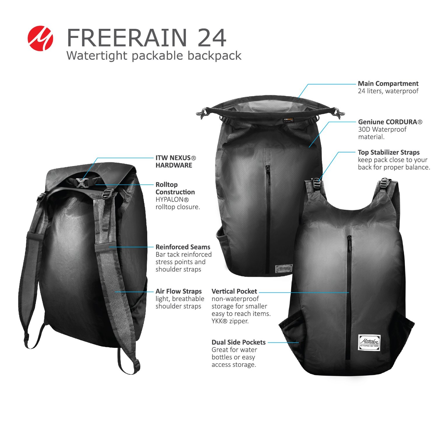 Matador FreeRain24 je sklopivi ruksak koji se može spakirati do veličine džepa, a kada se rasklopi to je vodootporan ruksak od 24 litre. Izrađen od izdržljivog 30D Cordura najlona i ojačan ultra-izdržljivim Hypalon materijalom otpornim na trganje, također ima ušivenu zaštitu od kiše i vodootporan glavni džep. Ukrašena je zračnim trakama s podesivim stabilizatorima.