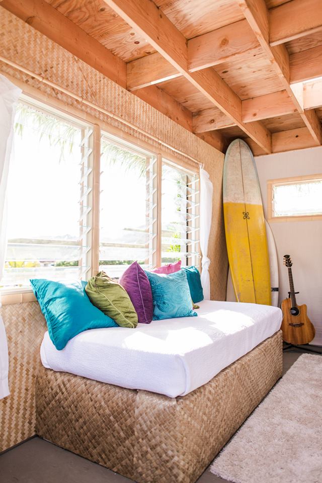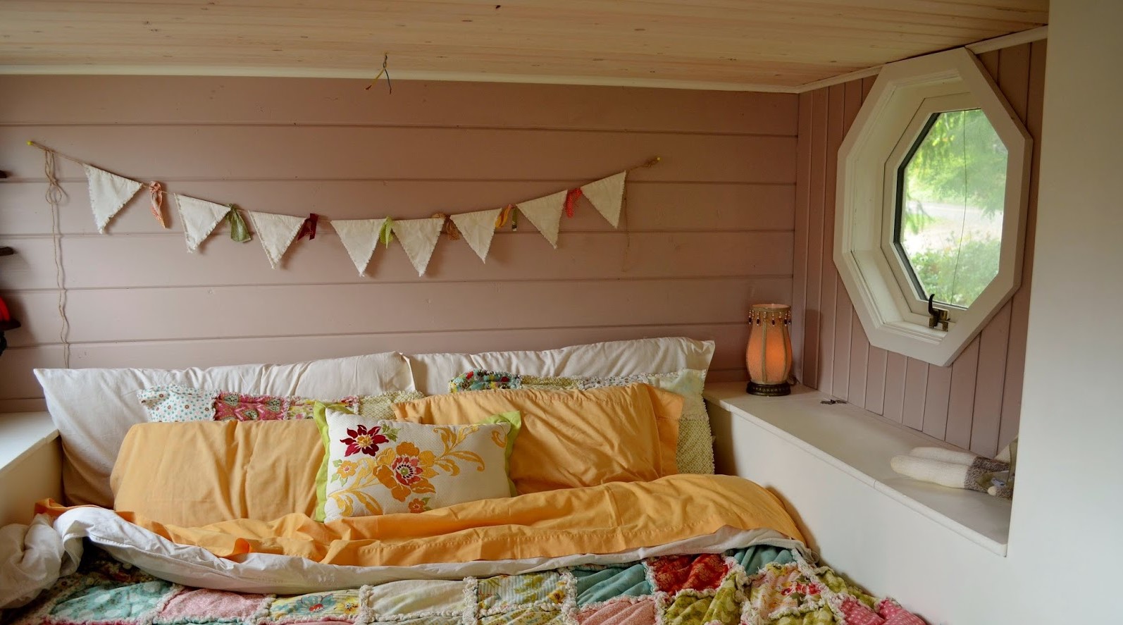 Iznimno visoki stropovi zajedno s obijeljenim drvenim zidovima nude svijetao prostor i mnogo prostora za pohranu. Ugrađene klupe nude jastučiće za sjedenje i spremište, s krevetom iznad.