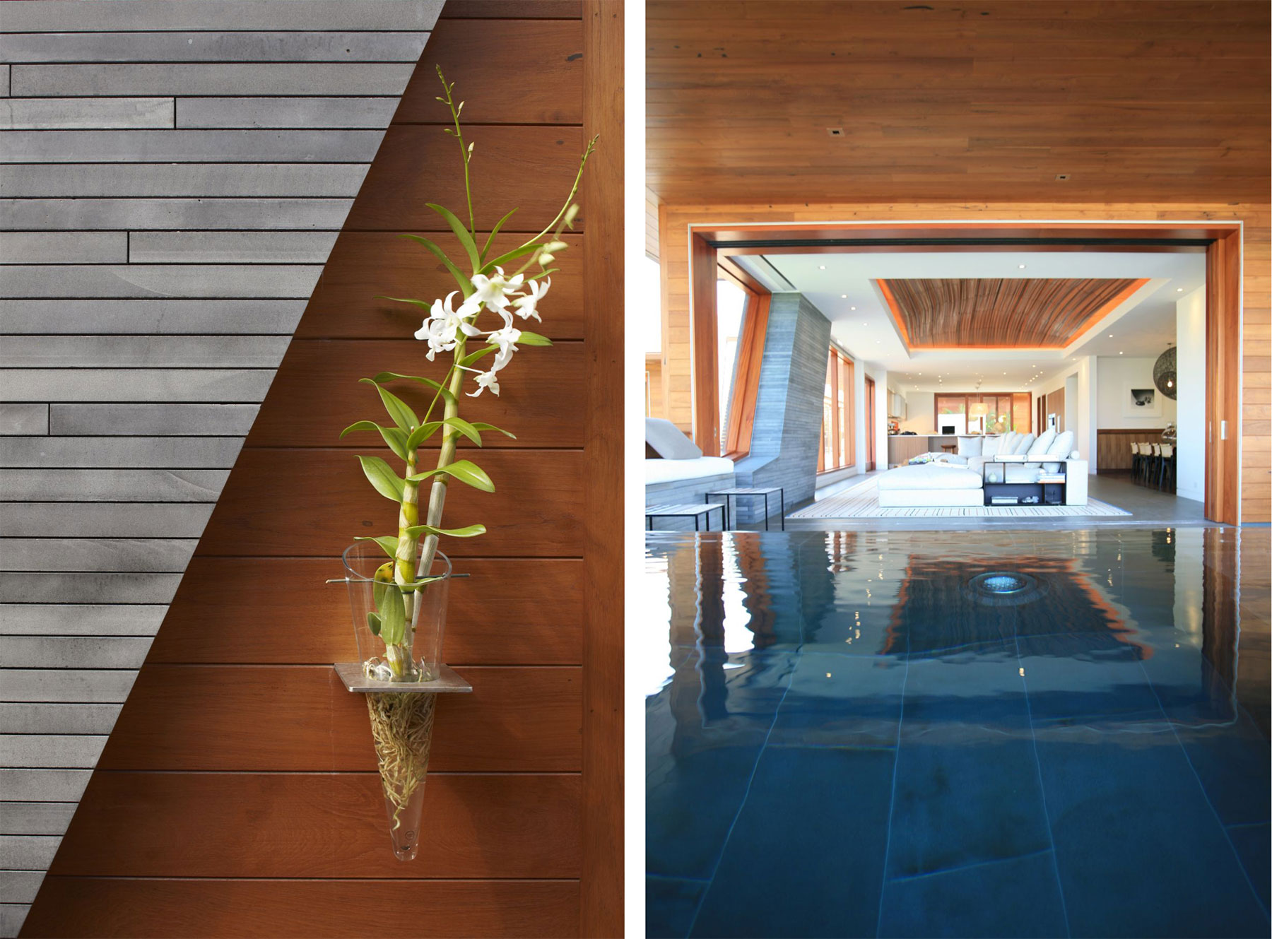 Prolazi od sjevera prema jugu niz paralelnih zidova, obučen u grede od sive tikovine, dobiven i ponovno prerađen iz starih štala i željezničkih tračnica. Eksterijer je suptilno povezan s interijerom velike staklene pregrade, uokviren toplijim tonovima drveta. Moderna arhitektura također zadovoljava neke moderna zahtjevi za energetska učinkovitost, praveći i imanje samodostatan. Ovako se postavlja na krov dvostruki set solarnih ćelija, tri bunara pohranjuju kišnica za navodnjavanje zgrade, izbor tamnije vulkansko kamenje ali pomaže da se prirodno zagrije i bazen i interijer.