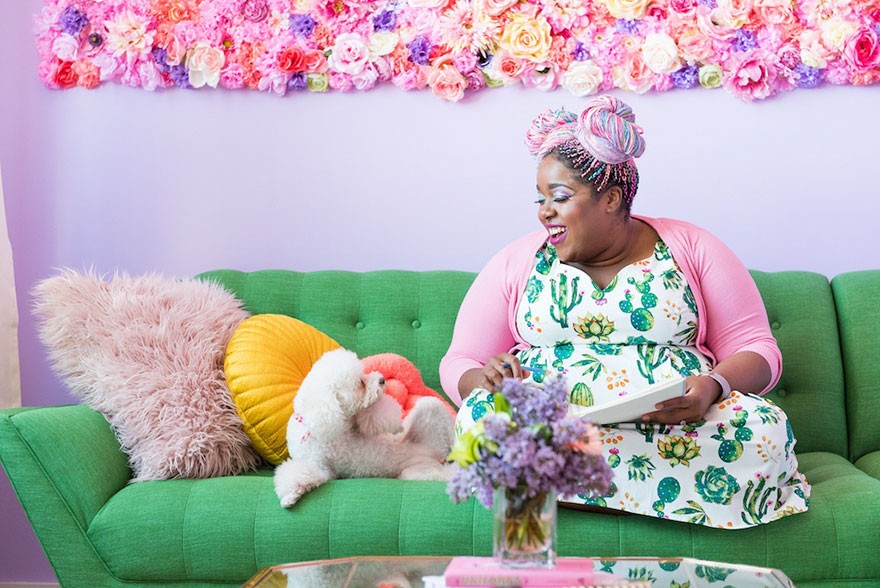 Vijoličaste stene, pastelne omare, cvetje na steni, mikrovalovna pečica Hello Kitty, barviti papirnati žerjavi, ki visijo s stropa – vse to najdete v stanovanju Amine Mucciolo. “Zelo pomembno je, da stanovanje odraža mene in mojo osebnost, kot tudi osebnost mojega moža,” dodaja Amina. “Želiva si, da je najino stanovanje zabavno, srečno in navdihujoče.” Tudi sama si večkrat splete mavrične kite, se obleče v barvita oblačila in se odloči za ličenje z bleščicami.