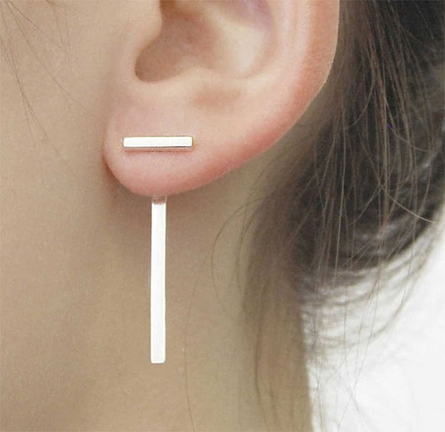 Zapravo, trebate ih samo jedna rupa u uhu. Svaka naušnica je izrađena od srebra i izrađena ručno. Nosite ih na isti način kao i viseće naušnice. Nakon što ih gurnete kroz rupu, samo ih morate okrenuti da dohvate dvostruki piercing učinak.