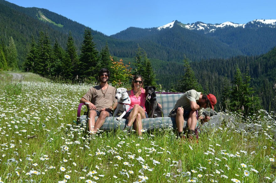 Trije dobri prijatelji – dva fanta in punca – so nekega dne spakirali najnujnejše in s kombijem odšli na pot po Sjeverna Amerika. Družbo na potovanju sta jim delala dva štirinožna prijatelja, s seboj pa so vzeli tudi kavč, ki je na potovanju odigral prav posebno vlogo. “Razjahan” dvosed namreč lahko vidimo v zanimivi seriji fotografij, ki sestoji iz edinstvenih posnetkov, na katerih hudomušni prijatelji, psa in kavč pozirajo v prečudoviti naravi. Na vsaki fotografiji eden od prijateljev gleda vstran ali počne nekaj popolnoma drugega kot ostala dva, ki gledata v fotoaparat.