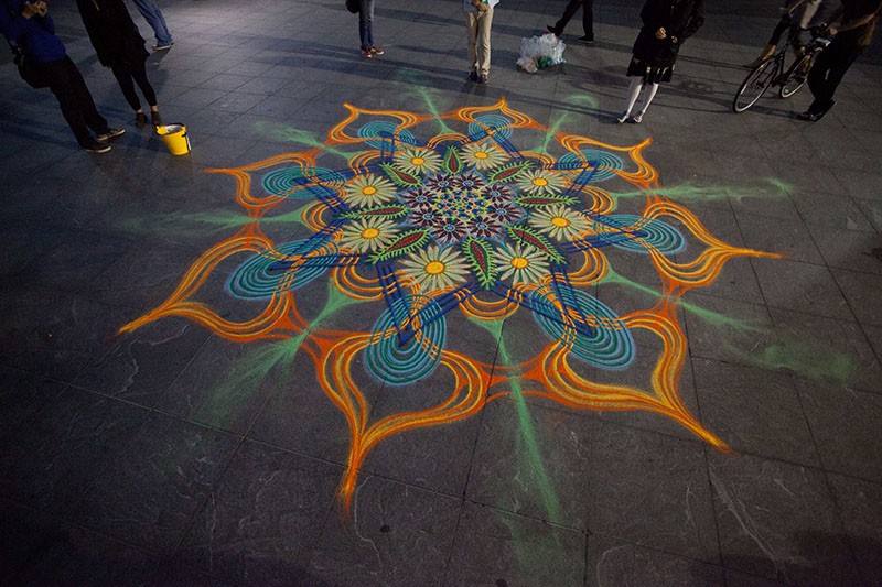 Naoružani vrećama obojenog pijeska se Joe Mangrum posljednjih nekoliko godina šeće gradskim ulicama stvarajući njime nevjerojatne uzorke. Svaki njegov rad potpuno je spontan i nastaje u trenutku inspiracije. Traje između šest i osam sati, a inače ih je umjetnik do sada napravio oko 550.