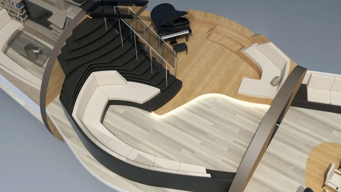 Naći ćemo ga na Carapaceu tri 'kata', a na njima kabine za goste, kutak za opuštanje, wellness centar, bar i drugo. Superjahta će biti prikladna za privatni odmor ili za poslovanje sastanci, u kojem je poželjno savršen tajnost. Pitanje je hoće li Carapace ikada ugledati svjetlo dana i postati nešto više od toga koncept. U ovom trenutku tehnologija još nije dovoljno razvijena za tako velik projekt. A i da jest, bila bi cijena takve posude po svoj prilici stotine milijuna eura.