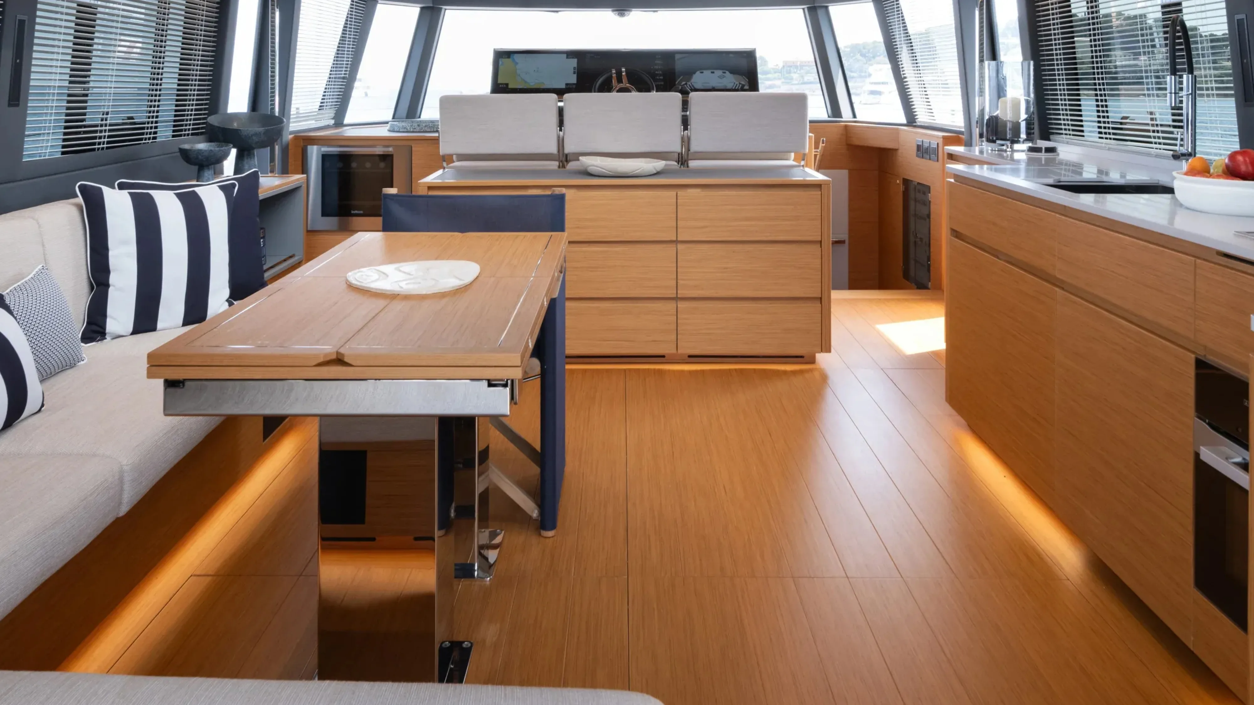 Dnevni boravak opremljen je integriranim TV-om, podesivim stolom za blagovanje i skrivenim zvučnicima koji stvaraju ugodnu atmosferu za svaki trenutak - od jutarnje kave do večernjih koktela. Kuhinjski pult uključuje sudoper, hladnjak za vino, aparat za led i škrinju za zamrzavanje - sve na dohvat ruke.