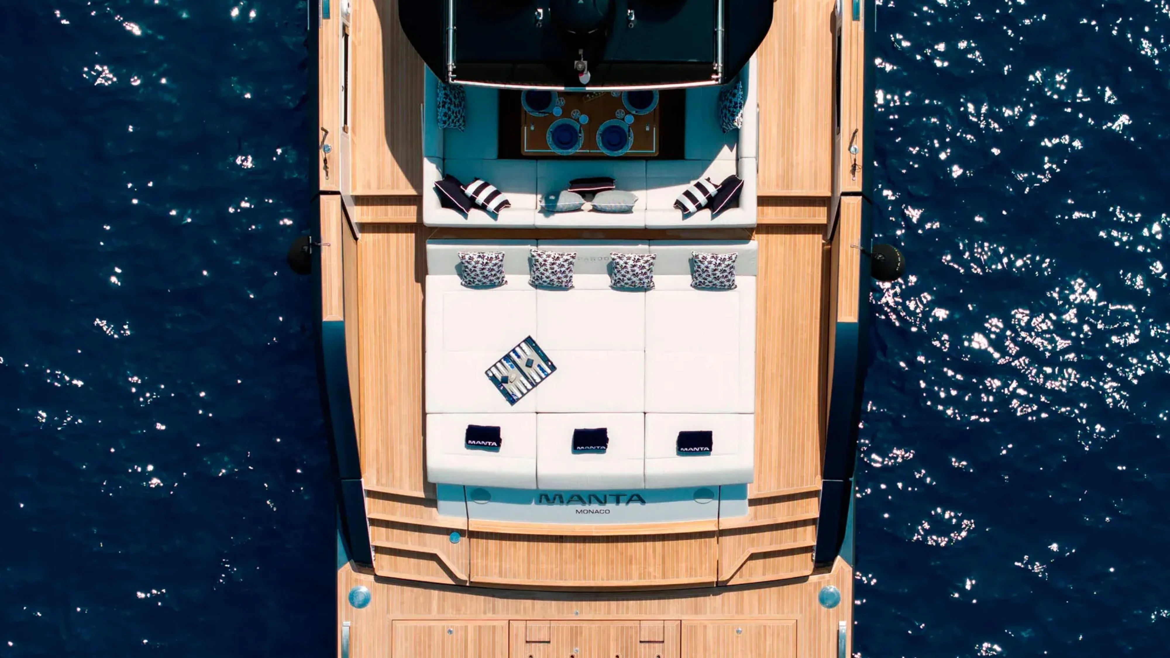 Tu je i garaža za gumenjak (do 3,25 m) ispod velike palube za sunčanje, skladišni prostori s obje strane i sklopive bočne platforme koje povećavaju širinu jahte na gotovo 7,3 metra.