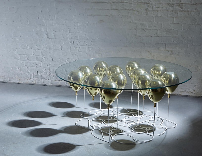 Stakleni stolić za kavu GORE Balon zamijenio klasične noge kao nosive elemente sa crveni, zlatni i srebrni baloni. Ali ne brinite, kao što je rečeno, ove nisu prave, tako da nećete morati držati helijevu bombu kod kuće, a uz to su žice umjetne i upletene na tlu uglavnom kako bi omogućile stabilnost i očekivano prijenosni kapacitet stolovi.